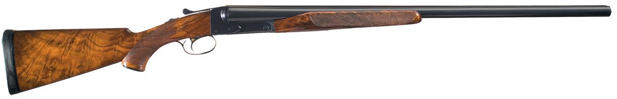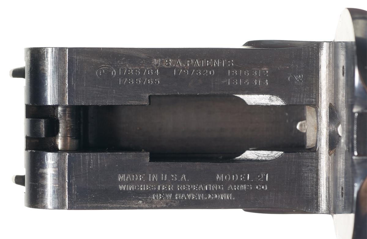 This Standard Grade shotgun was manufactured from 1936 to 1959 and features a single steel bead sight on a concave matte rib barrel with 2-3/4 inch chambers and choked full/ modified with ejectors. The left barrel is marked "WINCHESTER - 12 GAUGE/ 2 3/4 CHAM." at the action. The water table is marked with the U.S. patent numbers on the right side and model designation and address on the left side. Single selective trigger with push button selector, tang mounted manual safety, and mounted with fancy grain checkered beavertail forearm and pistol grip stock with a hard rubber grip cap and solid Kickeez recoil pad. Length of pull is 13 3/4".
