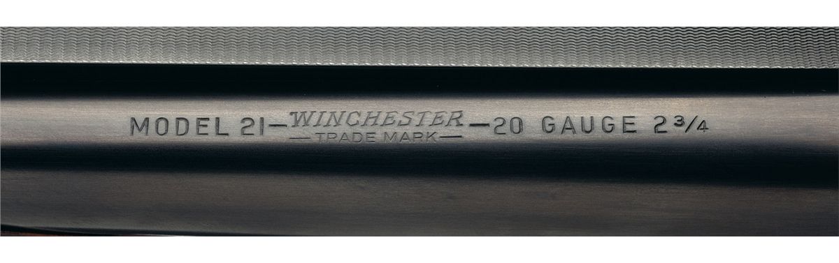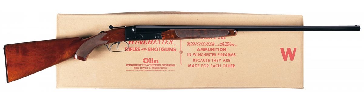 Manufactured circa 1947. Single red bead front sight, choked improved cylinder/modified and 2 3/4 inch chambers with ejectors. Tang mounted safety and double triggers. The barrel has the standard fourth style markings on the left barrel and the standard markings on the bottom flat. The water table has the standard markings. Mounted on a nicely figured checkered walnut beavertail forearm and pistol grip stock with checkered plastic buttplate. Length of pull is 13 inches. With correct style Winchester box and shipping box.