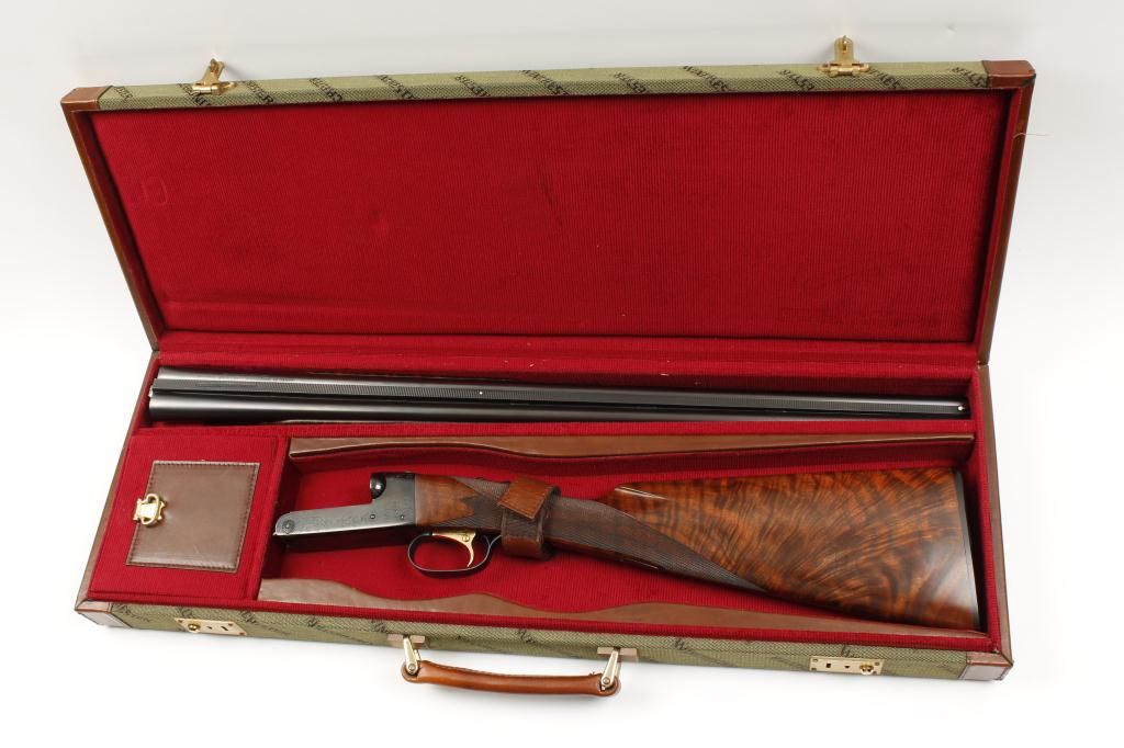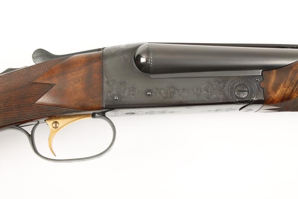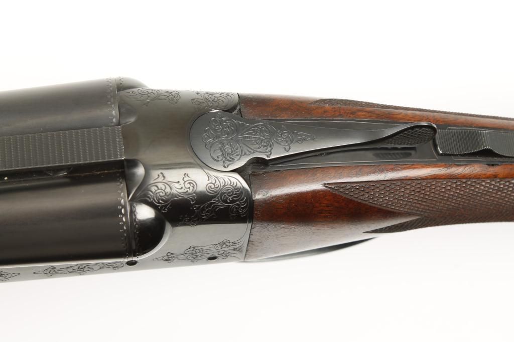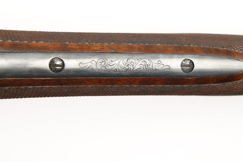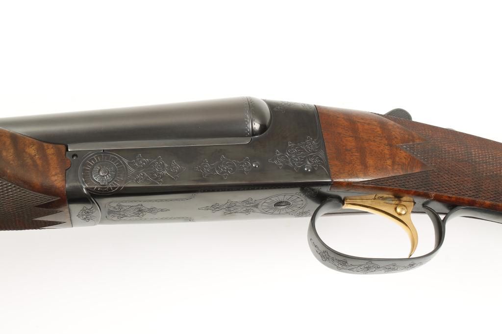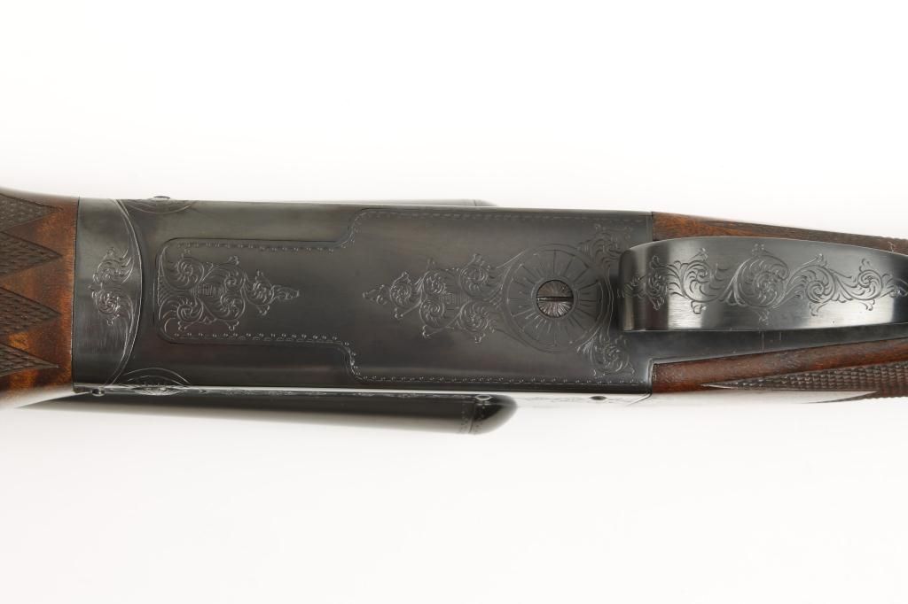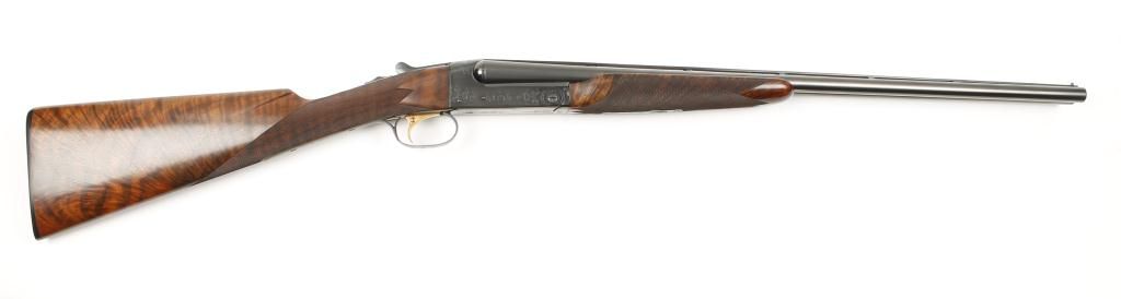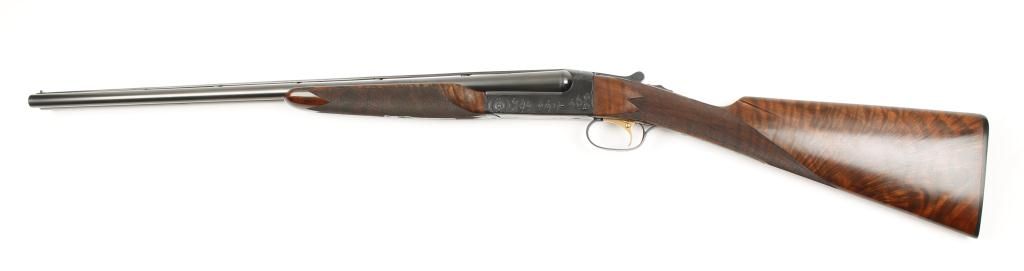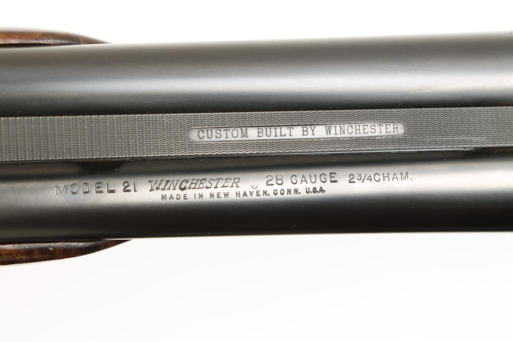 Winchester Model 21 custom grade, 28 gauge side-by-side shotgun with 26” barrels, ventilated rib, beaver tail forend, English style straight stock, factory scroll engraved, single trigger, auto ejectors,diamond cuts on inside of frame with polished water table and action, serial number 32665. The condition is fine to near excellent showing very slight use. The gun retains 98% to 99% original finish and the stock showsjust some minor handling. The stock measures 14 ½” to the end of the original hard rubber Winchester pad and is the original factory dimensions. Factory 28 gauge Model 21s are very desirable and seldom encountered. Est.:$8,000-$16,000.