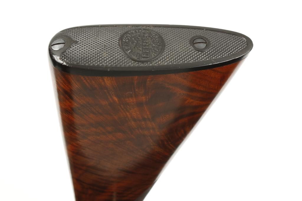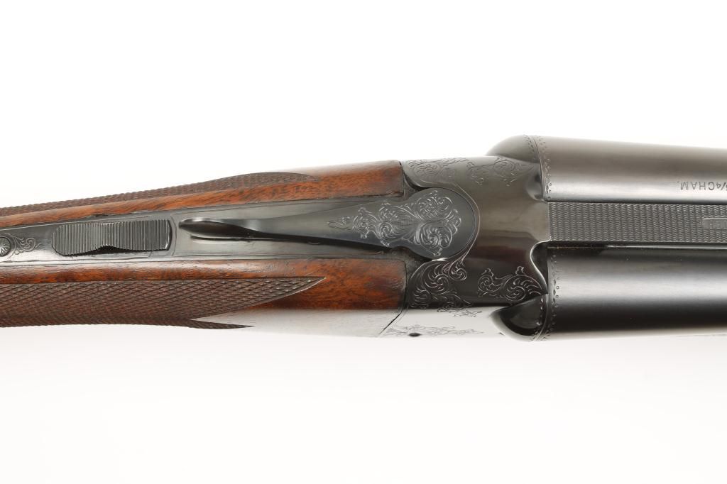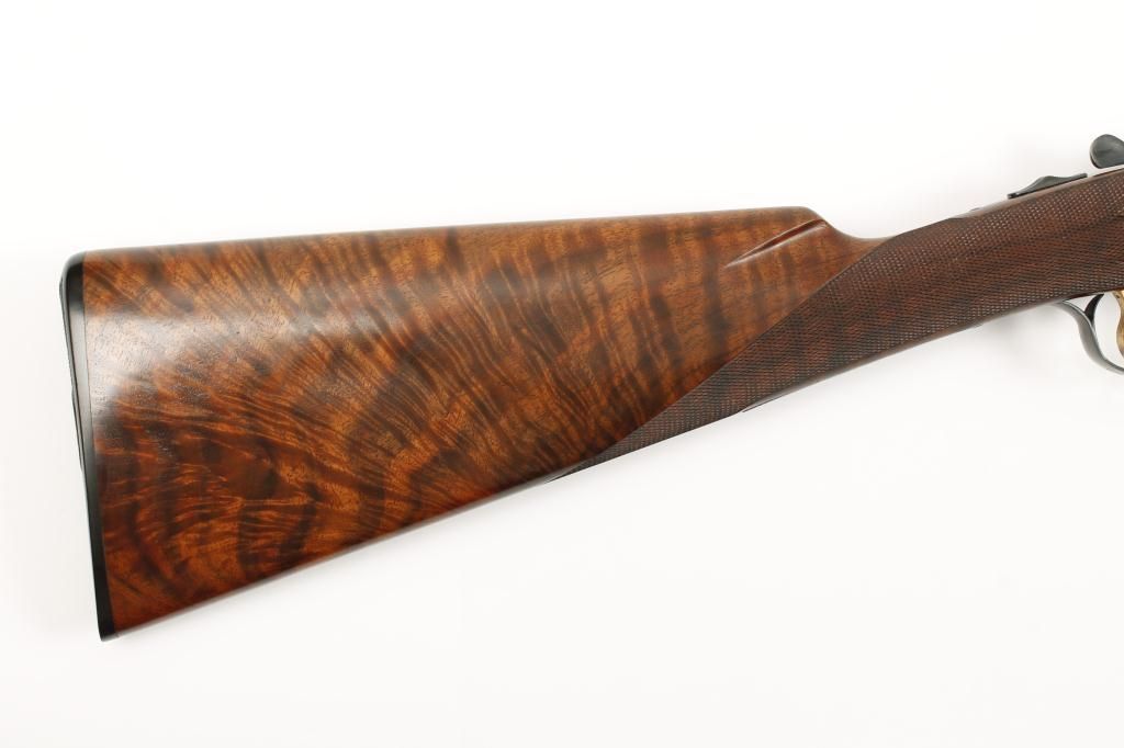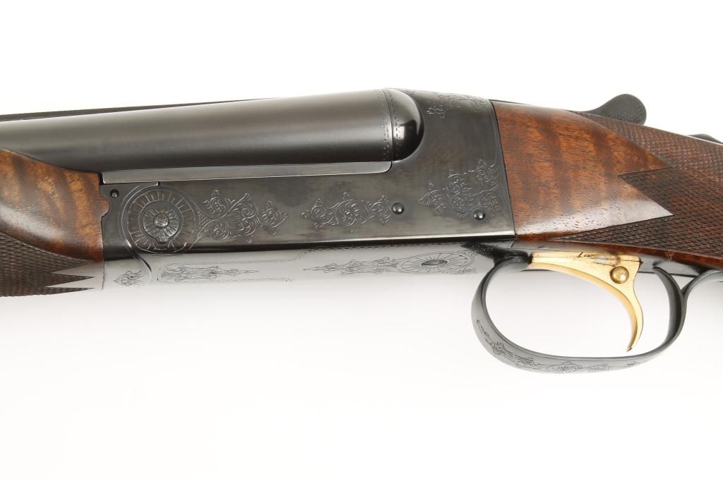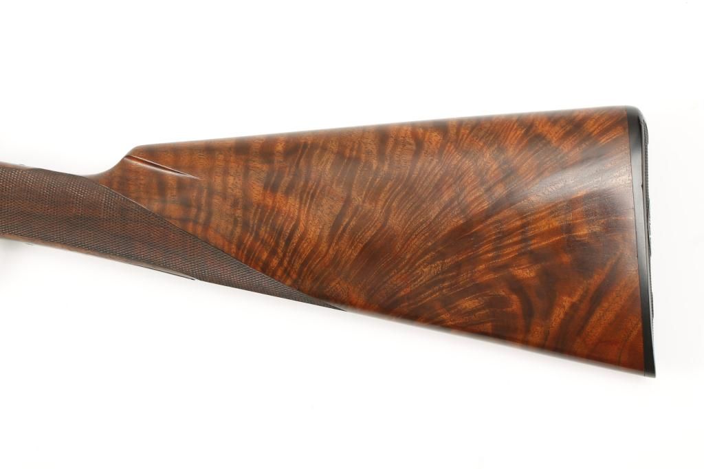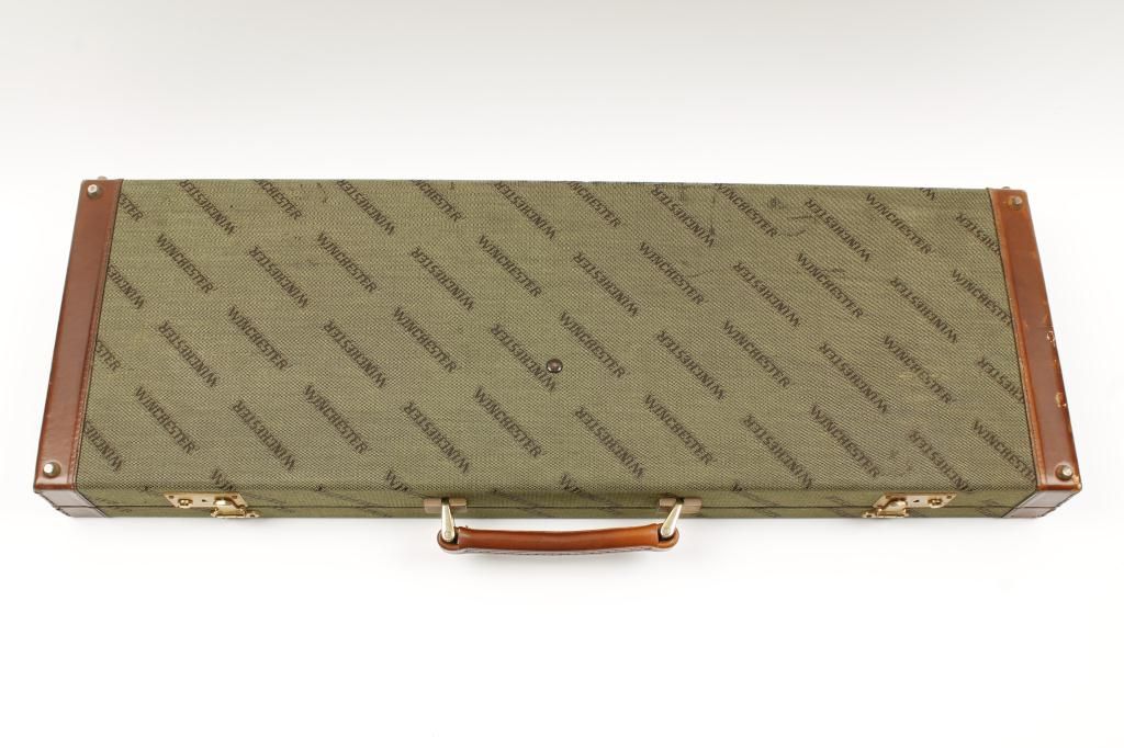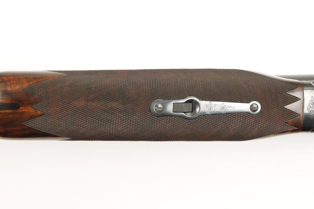 Winchester Model 21 custom grade, 28 gauge side-by-side shotgun with 26” barrels, ventilated rib, beaver tail forend, English style straight stock, factory scroll engraved, single trigger, auto ejectors,diamond cuts on inside of frame with polished water table and action, serial number 32665. The condition is fine to near excellent showing very slight use. The gun retains 98% to 99% original finish and the stock showsjust some minor handling. The stock measures 14 ½” to the end of the original hard rubber Winchester pad and is the original factory dimensions. Factory 28 gauge Model 21s are very desirable and seldom encountered. Est.:$8,000-$16,000.