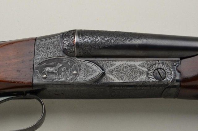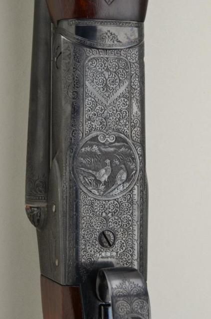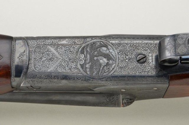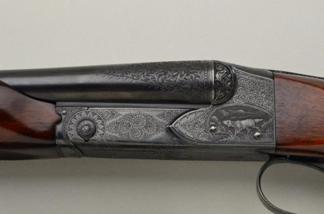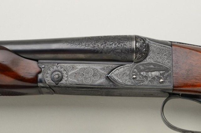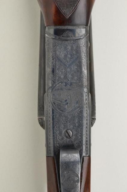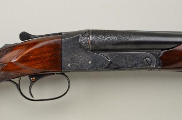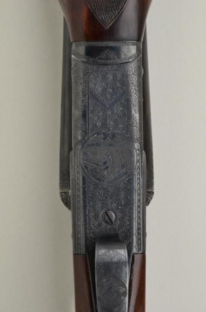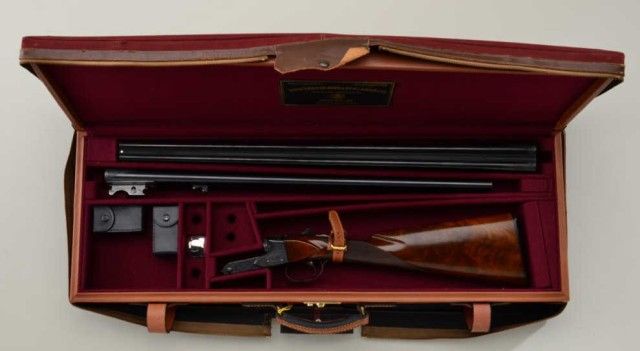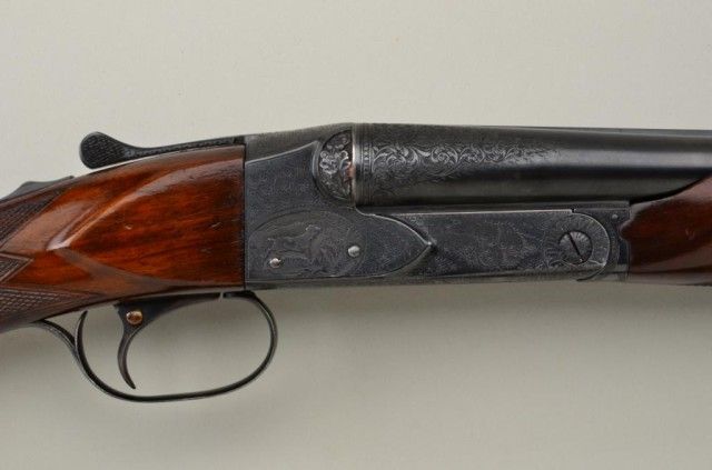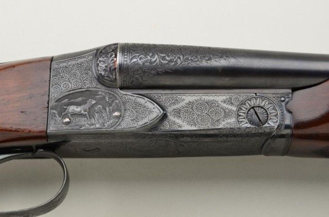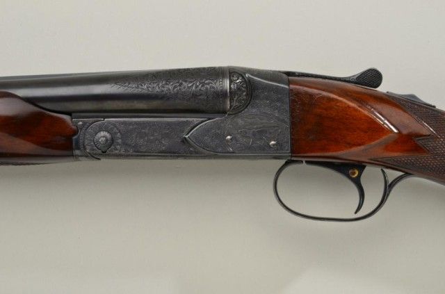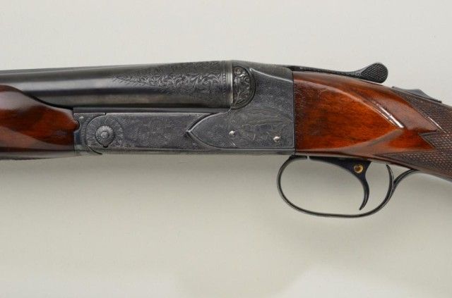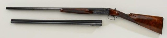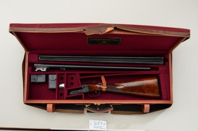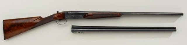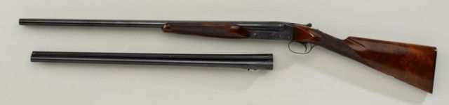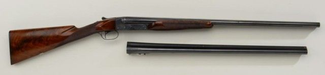 Winchester Model 21 grade 6, 16 gauge skeet gun with 26"& 28" barrels, 2-3/4" chambers finely factory game scene engraved and factory marked "Skeet" in front of trigger guard with Winchester case. Serial #18408.The gun shows single trigger, auto ejectors, 14-1/8" to end of hard rubber Winchester butt plate with English style straight stock and beaver tail fore end. The 26" barrel is choked WS1 & WS2 (skeet & skeet) and is anoriginal factory set of barrels. The extra set of barrels are 28" choked modified right and full left and show what appear to be German proofs with Bohler Blitz Stahl marking. The extra set of barrels are wellfitted and nicely made and engraved to match on the breeches but a gunsmith made custom addition. The engraving is very high quality possibly by Kusmit or another top factory engraver. The gun has been professionallyrefinished to excellent condition and shows bright bores in each barrel with no problems to barrels what-so-ever and water tables and inside of frame polished correctly. Very nice Model 21 that's ready to shoot. From