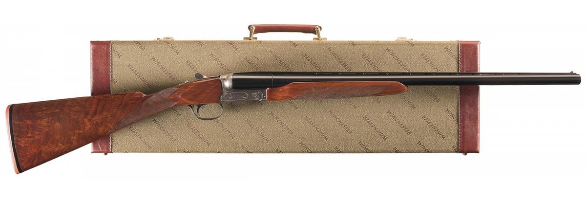 Manufactured in Japan from 1978 to 1986. Two ivory beads on the matte vent rib, choked improved modified/improved cylinder and 3 inch chambers with ejectors. The coin finished action and trigger guard are lightly floral scroll and border engraved with an engraved Pigeon on the bottom of the receiver. Jeweled water table and tang mounted safety/selector. Fitted with a deluxe checkered walnut forearm with lightly engraved hardware and a checkered straight grip stock with a solid rubber recoil pad. Length of pull is 14 1/4 inches. Complete with a Winchester hardcase.
