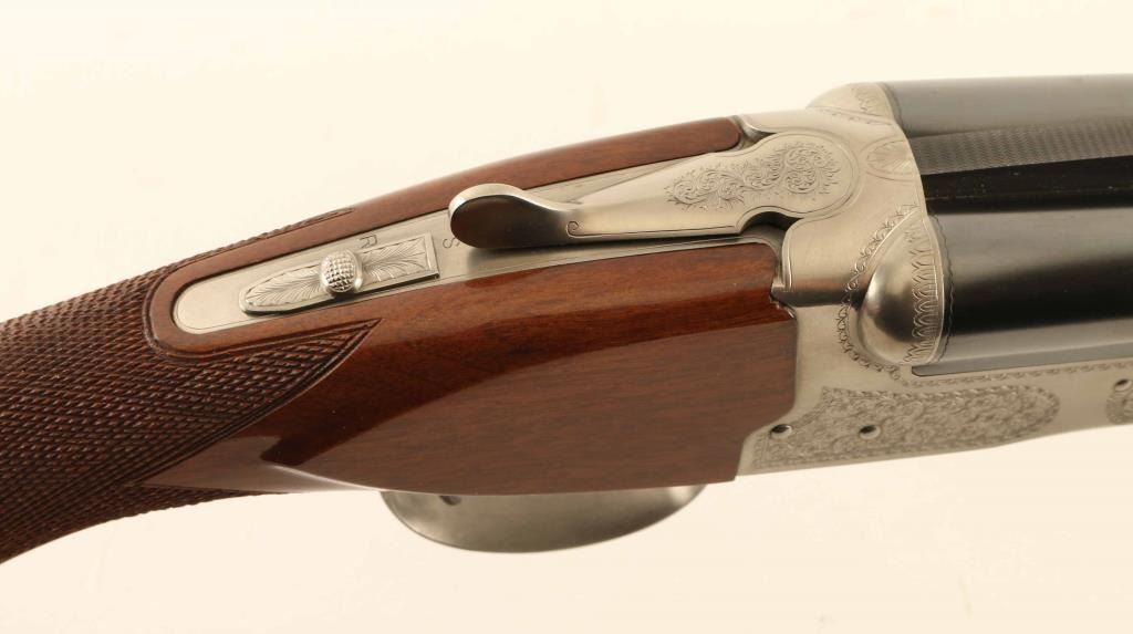 'Pigeon Grade' Embellished high quality side-by-side double barrel boxlock shotgun chambered for 3" 20 gauge shells, manufactured in Japan by Olin-Kodensha circa 1978 - 1986. Features blued 28" barrels with ventilated sighting rib & full/mod fixed chokes, automatic ejectors, white bead sights, coin-finished receiver with floral scroll engraving, knurled single selective trigger, sliding safety/barrel selector, checkered select walnut beavertail forend and pistol grip shoulder stock with round knob, factory recoil pad & 14" length of pull. Includes a factory beige leather wrapped luggage case with lined interior, Winchester brass plaque and documents. Shotgun exhibits approximately 99%+ of it's original finish with only a few miniscule scratches on the barrel observed. Action is tight, the bores are pristine and the wood stocks are near fine with minor imperfections. Condition is near NRA Perfect in case. ***Modern Firearm***