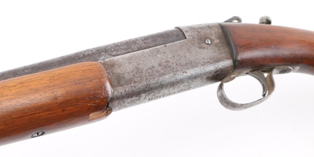 Single shot break open shotgun for 2-3/4" shells. Features shortened 24" barrel, steel front bead, manual cocking button. Smooth wood forend & semi-pistol grip shoulder stock with Western Field buttplate. Bore is very good condition, choke measures IC. Metal shows full coverage of a fading finish, now mostly brown or gray, with edge losses. Stock is good or better condition with minor scratches. The exposed hammer spur has been repaired with braised metal. NRA Condition-Fair. C&R Firearm.