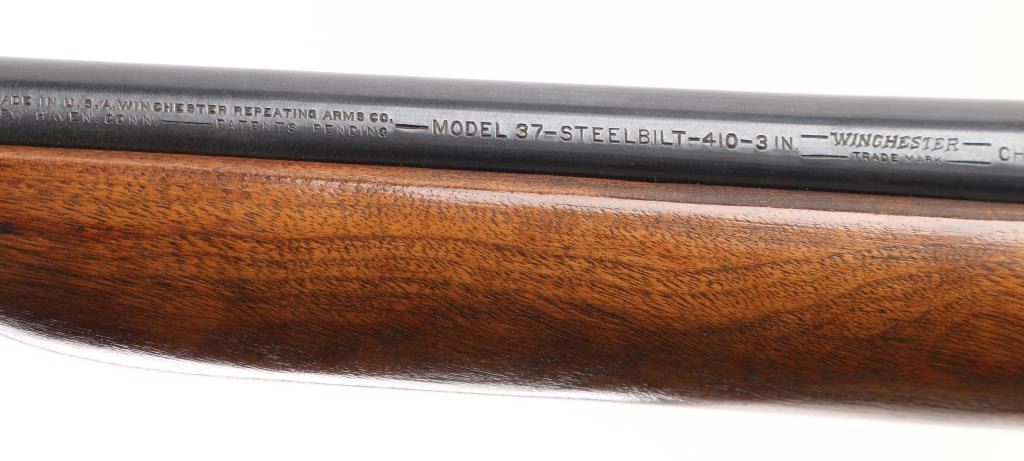 American made break action shotgun. The 410 gauge production started in the second year (1937). M37's were manufactured without date stamps or serial numbers. It has a 26" blued barrel and receiver with silver bead front sight, straight grain wood stocks with Winchester buttplate. LOP is 14". Bore is excellent/bright. blue metal finish is about 98% Wood stocks are very good with a few very minor dings. Barrel locks up tight. Condition is NRA Very Good+. C&R Firearm.