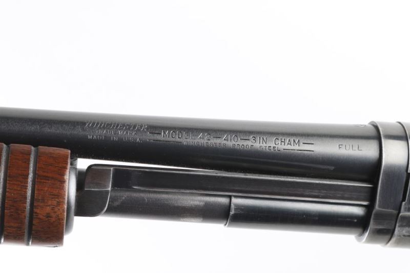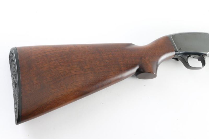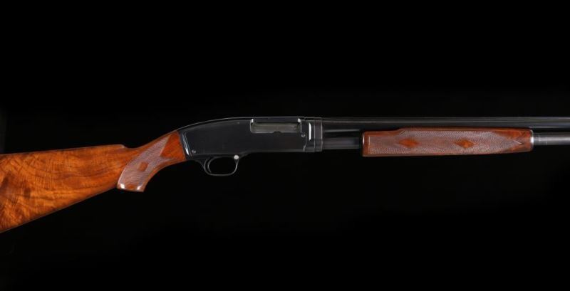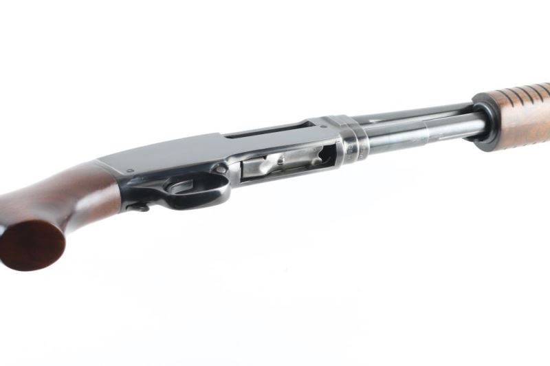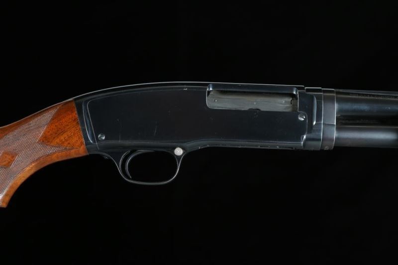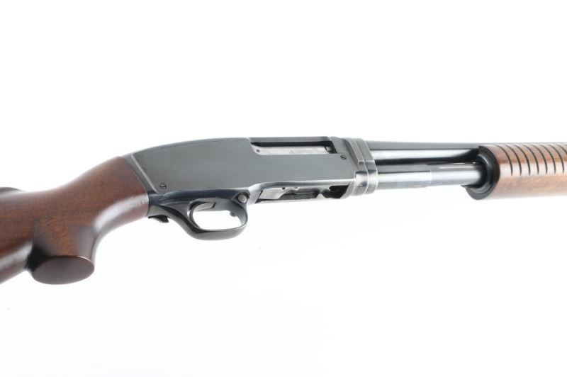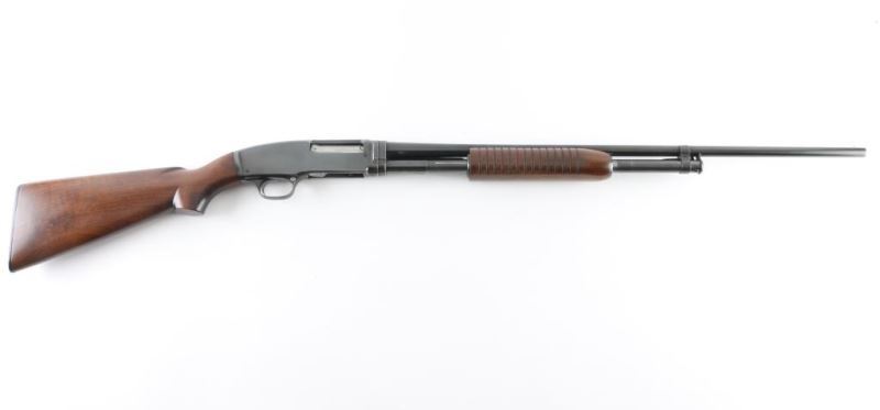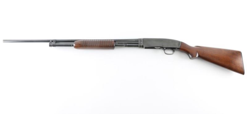 Pump action shotgun manufactured circa 1953. Features blued finish, select walnut with grooved pump handle & smooth curved wrist stock, factory plastic buttplate, 26" plain barrel, accepts 3" shells, choked "Full", steel front bead, push button safety. Bore is very good condition. Retains 90% finish with finish loss on all raised edges, small scratches on receiver, some bare metal where moving parts rub. Wood is excellent with few small dents. Condition is NRA Very Good++ *** C&R Firearm *** [From the Jim Sigmon Collection]
