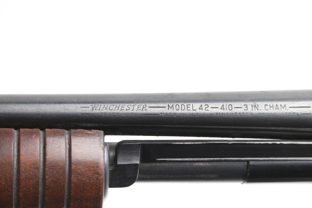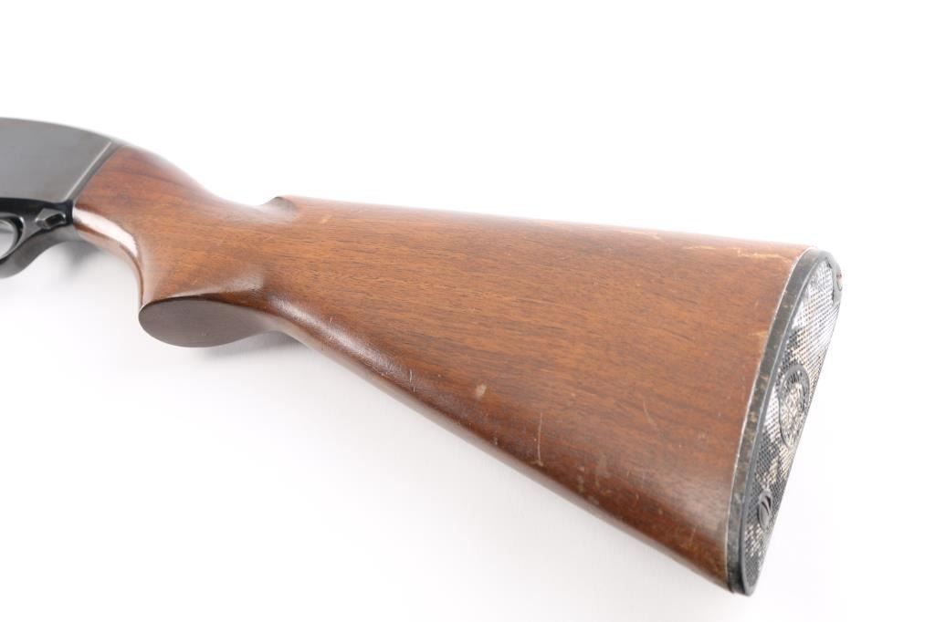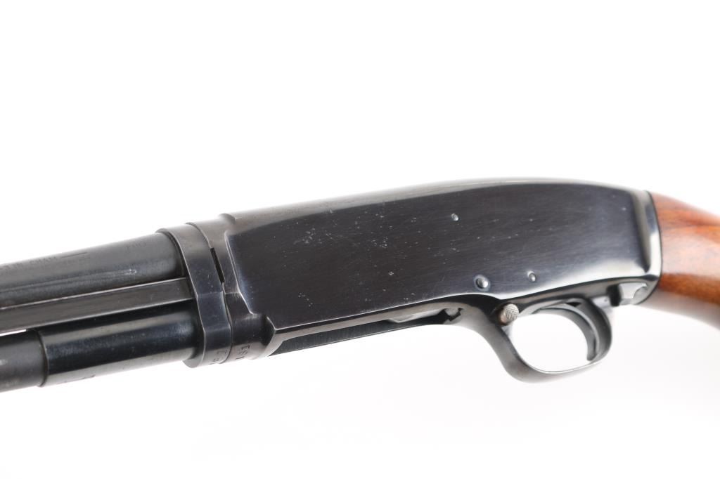 Vintage take down pump action shotgun manufactured circa 1961. Features blued finish, grooved 'corn cob' walnut pump handle, smooth walnut stock with curved wrist, factory butt plate, 28" plain barrel, accepts 3" shells, choked "Full", steel front bead, push button safety. Receiver extension numbered to receiver. Bore is excellent/bright. Retains about 94% finish with scratches & edge losses, some bare metal where moving parts rub. Wood is very good with minor scratches/dings, action is smooth.