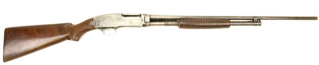 pump action shotgun with 26" barrel and walnut stock, barrel retains 20-30% original blue thinning, remainder silver gray patina, receiver retains 65-75% original blue, stock show no crack or repairs, scattered light dings and dents. Very