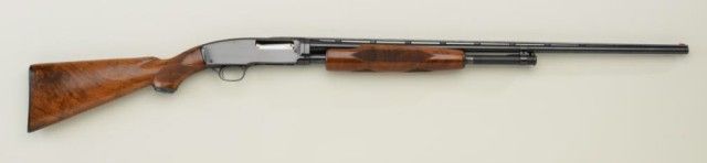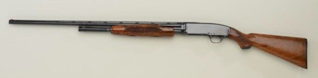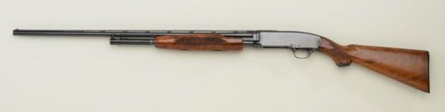 Winchester Model 42, 410 gauge factory skeet marked pump action shotgun with Simmons rib and 28" barrel, serial #158616. The gun shows factory pattern checkering and has been finely restored. Approx. 95-98% blue finishremains and stocks are fine to excellent as refreshed. Hard rubber Winchester pad. Engine turned bolt and follower. Good action, good bore but dirty, would clean. Robert E. Petersen collection. Est.; $1,400-$2,800.