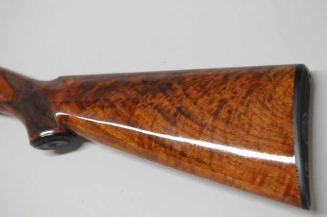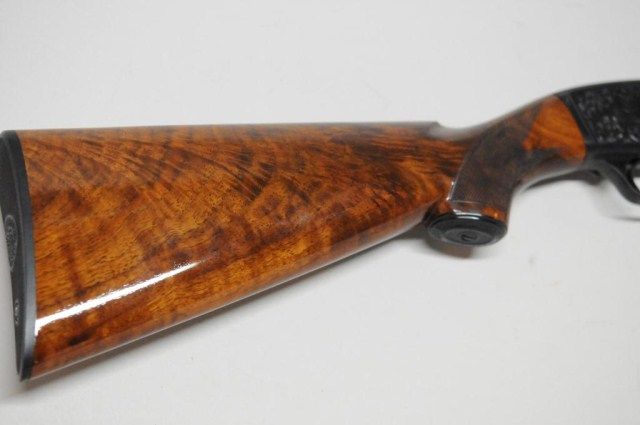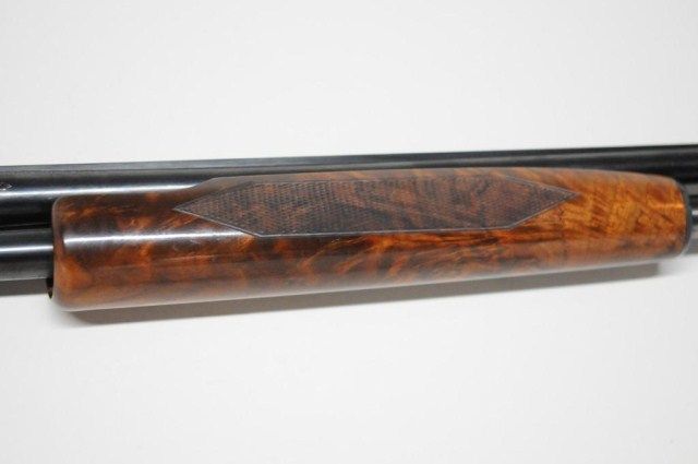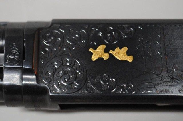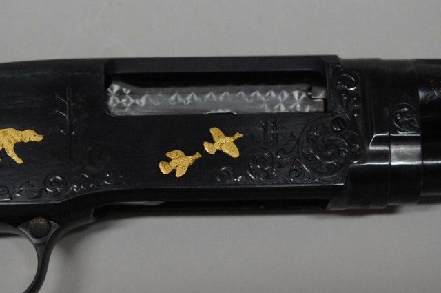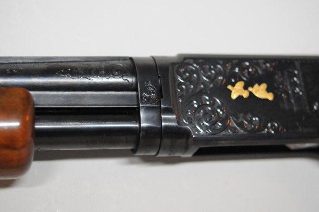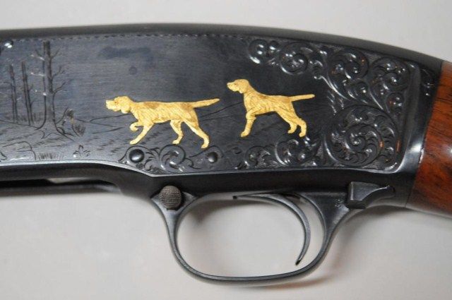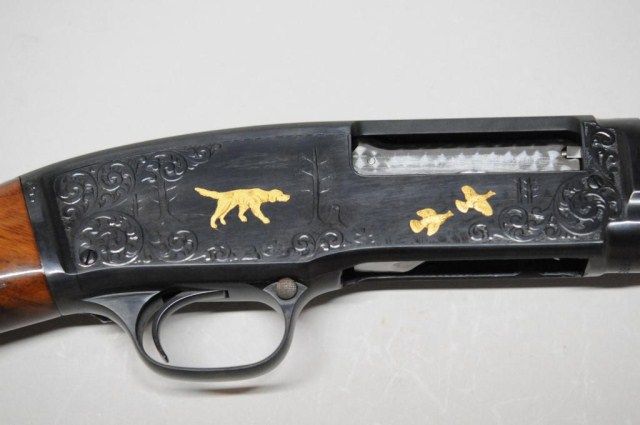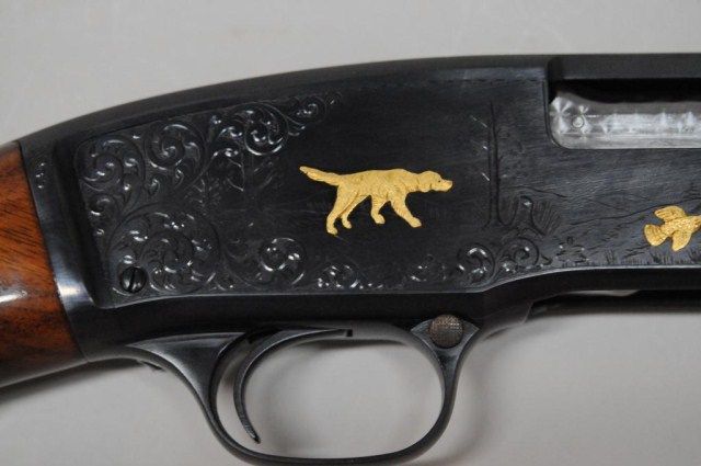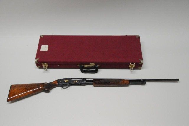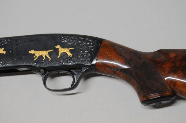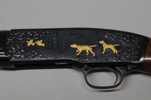 Winchester Model 42, 410 gauge pump action shot gun custom engraved and gold inlaid with upgraded deluxe checkered wood stocks and carrying case, serial #9856. The gun is nicely engraved and gold inlaid in aWinchester influenced pattern showing dogs flushing game on left and single dog on right surrounded by classic scrolls. The gun shows 26” barrel with raised non vent rib and factory skeet choke. The magazine tube shows an engraved pigeon remark. The condition is fine to excellent as restored at time of embellishment and upgrade. Stocks are fine to excellent and checkered in a factory style pattern with select burl wood grain. Thegrip cap and butt plate are Winchester marked. The stock measures 14” to the end of the hard rubber butt plate and is factory specs. In canvas carrying case that is unmarked but of good quality. Est.:$2,500-$5,000.