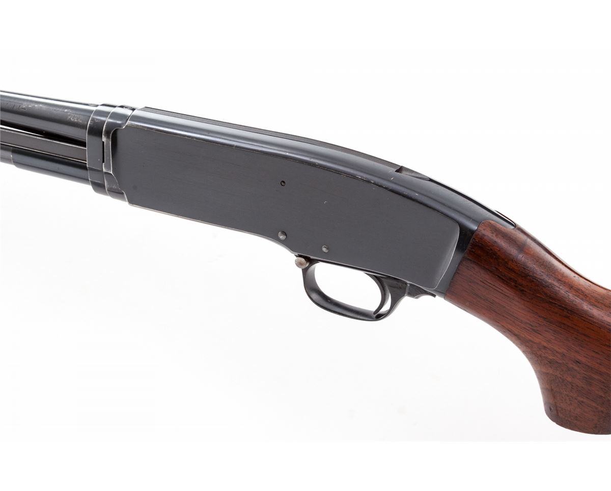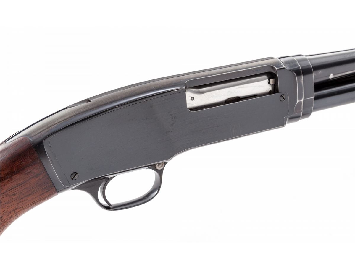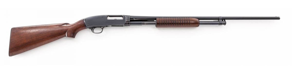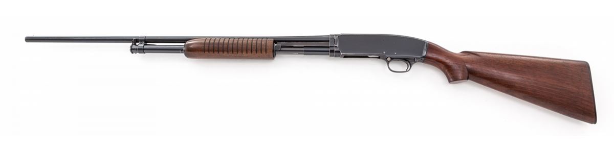 Winchester Model 42 Pump Action Shotgun, #100512, .410 ga., 26'' round barrel choked Full with 3'' chamber, blue finish, walnut stock and forend, with factory black rubber butt pad. Mfg'd 1953. Condition is excellent retaining approx. 97% lightly thinning blue with most of the wear at actioning area of magazine tube. Stock with light marks from handling. Action is crisp, bore is bright. Est.: $1,000-$1,500. (C&R)