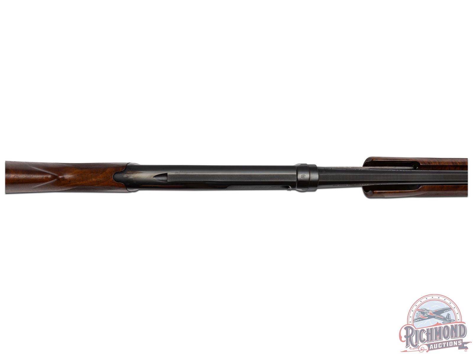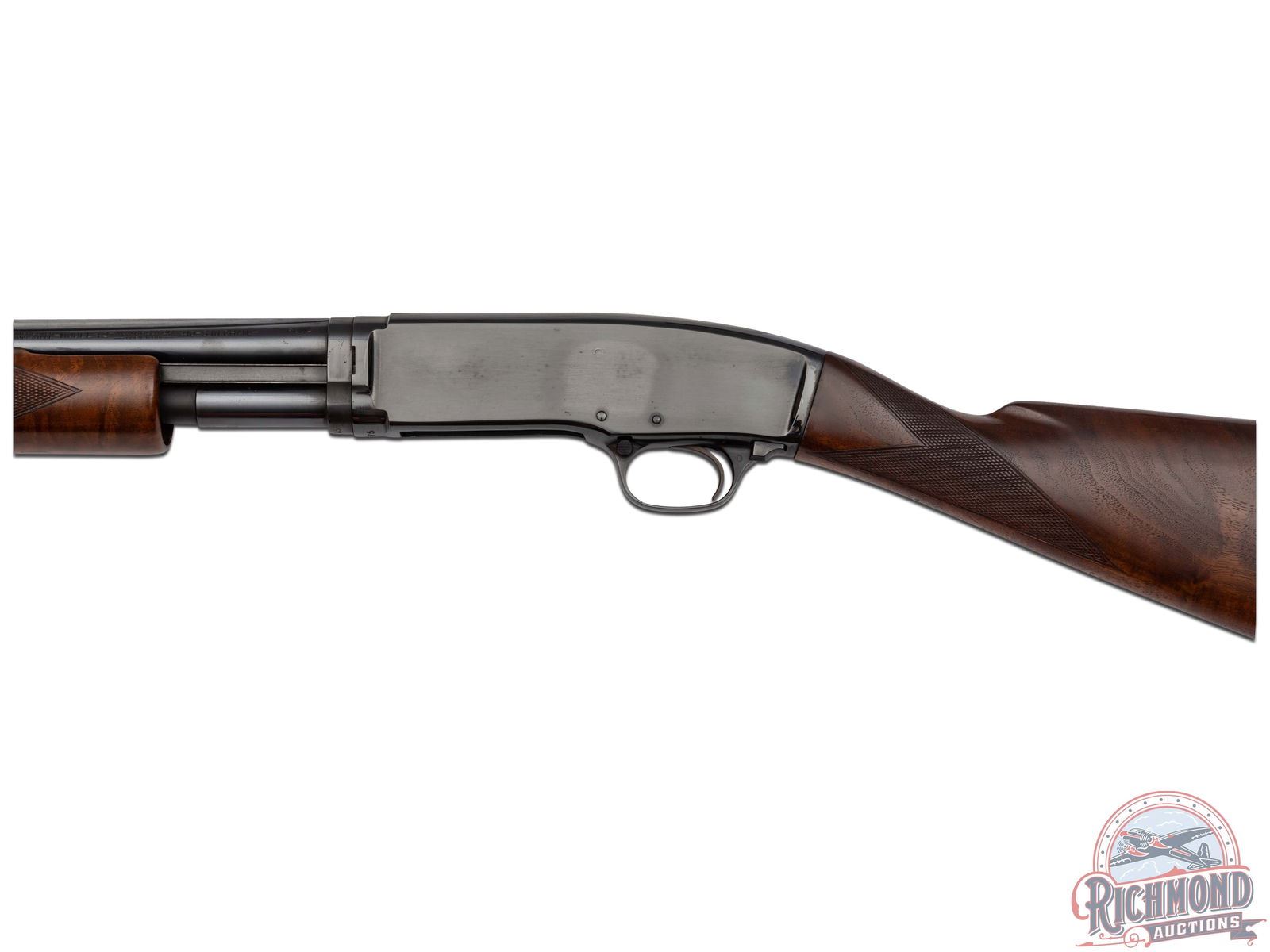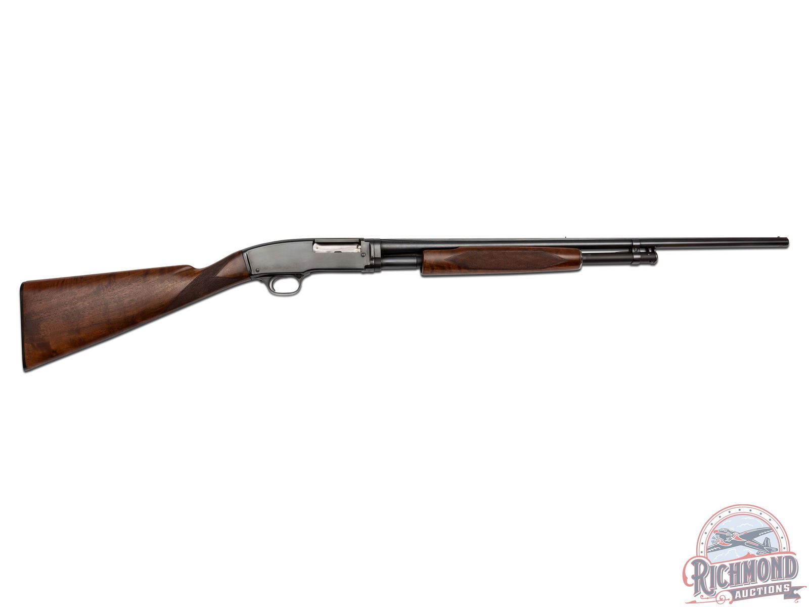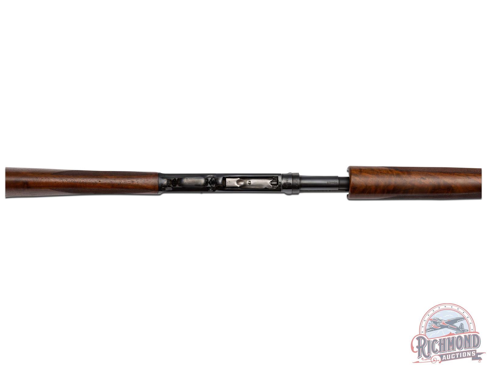 Made by Winchester Repeating Arms Company in 1946. 26" blued Winchester Proof Steel barrel in 410 caliber with raised factory matted rib, Full choke, 3" chambers and standard Winchester barrel markings. Blued takedown frame matted finish 2/3 magazine. Winchester factory walnut checkered English grip stock with Winchester hard rubber butt plate. Walnut checkered swelled Deluxe forearm. J.T. Livengood Collection. LOP: 14". DAC: 1-1/2". DAH: 2". CALIBER: 410. S/N: 53075. FFL STATUS: Curio & Relic.