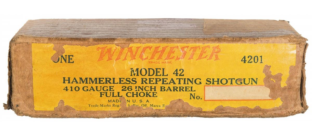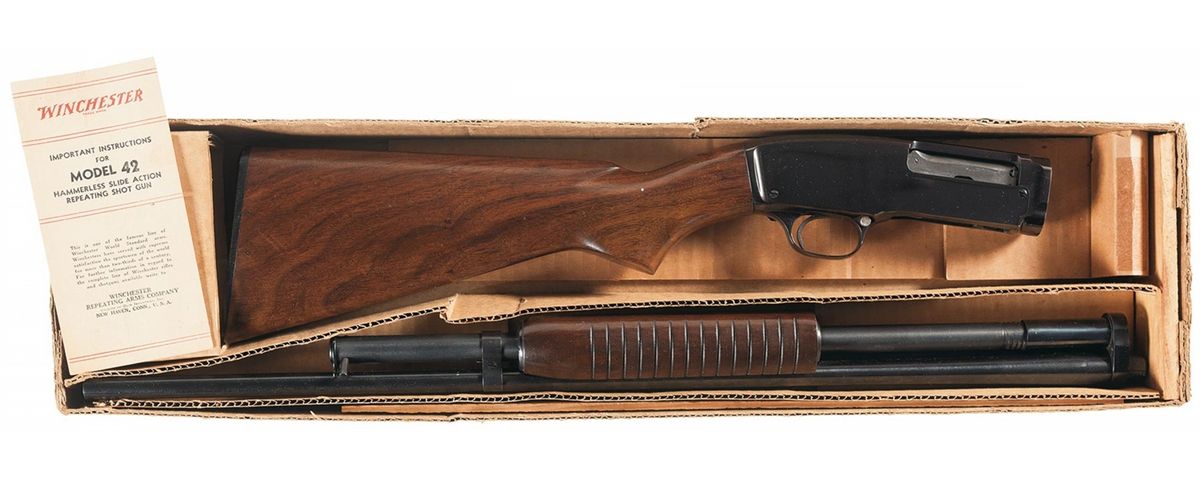 Manufactured in late 1961. Single front bead sight, 3 inch chamber and full marked choke. Standard Winchester markings including the factory proof on the barrel and receiver. 14 groove flat bottom forearm and smooth pistol grip stock with factory plastic buttplate. Length of pull is 14 inches. Comes with a correct Model 42 factory box which is not numbered.
