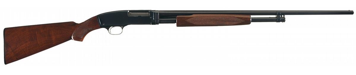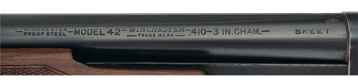 Manufactured in 1941. Single bead sight on the matte solid rib, 3 inch chamber and choked skeet. Standard barrel markings with "SKEET" at the breech, Winchester oval proof on the upper left side of the barrel and top of the receiver at the breech. Matching serial number on the receiver and takedown ring, all blue finish and mounted with a checkered walnut forearm and pistol grip stock with checkered hard rubber Winchester buttplate.