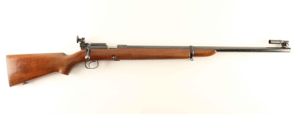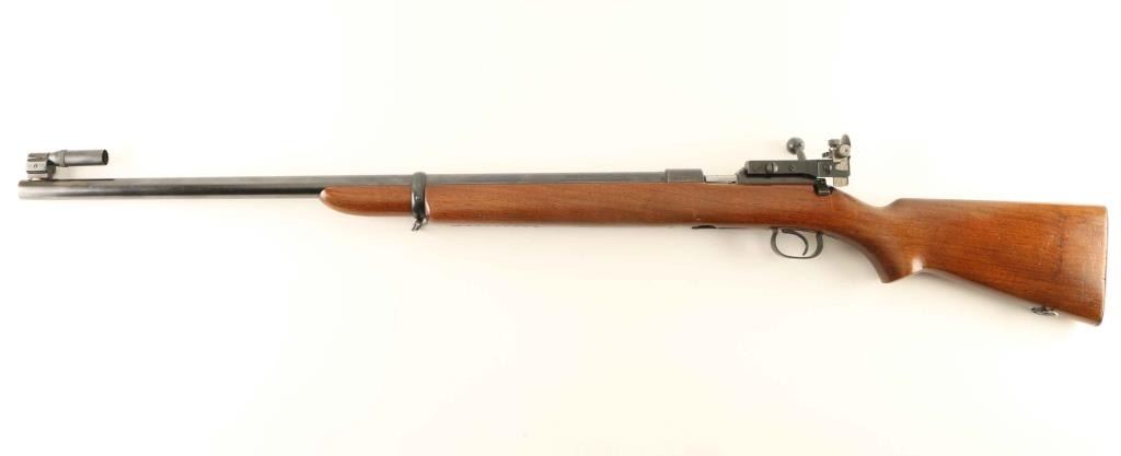 Vintage magazine fed bolt action target rifle chambered in .22 Long Rifle, manufactured circa 1936. Regarded by many as one of the finest small-caliber rifles ever built. Features a blued finish, 28" heavy barrel which is drilled & tapped for scope blocks, Lyman #77 globe front sight with orange disc, Marble-Goss adjustable rear aperture sight, serrated trigger, manual safety, sling swivels, factory magazine, and one piece walnut pistol grip shoulder stock with accessory rail in the beavertail forend and knurled metal buttplate. Rifle retains approximately 85% of it's blued finish showing scattered light wear and thinning. The bottom metal has has a hole drilled with threads to accommodate a rest. Action is smooth, the bore is excellent, markings are very good with some breaks in the address on the right side of the barrel, the rear sight shows some light emerging rust and the wood stock s very good with scattered dings. Condition is NRA Very Good++. ***C&R Firearm***