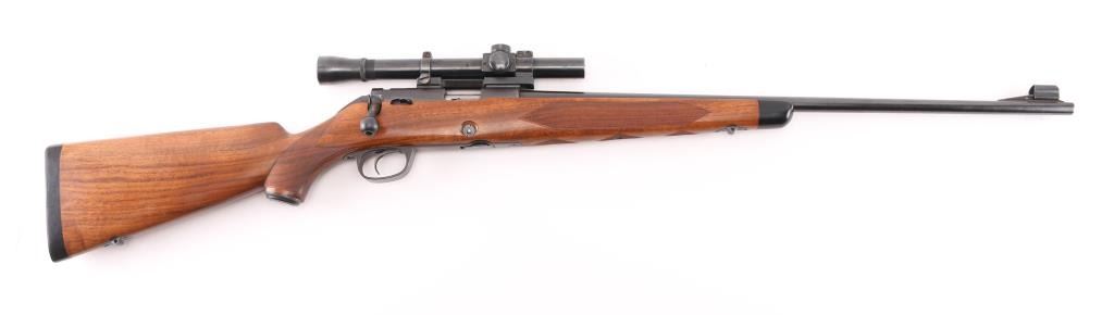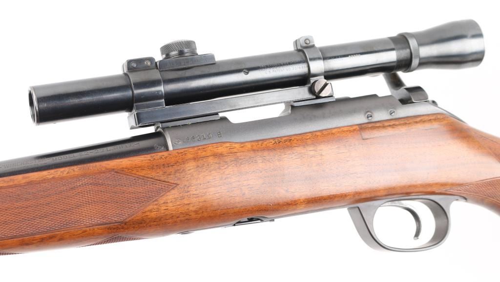 Vintage Model 52 manufactured in 1948. The left side of the barrel is marked " Made in Hew Haven Conn, U.S. of America". “Winchester / Proof Steel / Model 52 / Winchester / Trade Mark . .22 Long R.”. There is a Winchester Proof Mark on the left side of the barrel and the frame. The left side of the frame is marked “66319 B”. The right side of the receiver is marked “Made In U.S.A. Winchester Repeating Arms Co. / New Haven, Conn. – Patented -” and “Winchester / Trade Mark”. 24" tapered barrel with hooded post/bead front sight, provisions for a receiver mounted peep sight, left receiver drilled/tapped, manual safety, push-button mag release inletted in right stock, beautiful oil finished walnut stock with fine point checkering at the wrist & forearm, blued steel grip cap. factory checkered hard rubber butt plate with wide ebony spacer, ebony forearm tip, sling swivel studs cheek piece for right handed shooting. One piece Redfield scope base installed on receiver and fitted with a vintage Lyman 2 1/2 power scope, clear optics. Bore is excellent/bright, action is smooth, original blue is about 97% with slight muzzle wear, and handling loss on the bolt handle, stock is excellent with some very minor scratches. Considering this 52 is 75 years old, you would be hard pressed to find one in better condition. Comes with original "W" marked 5-rd Magazine. NRA Condition-Excellent. C&R Firearm.