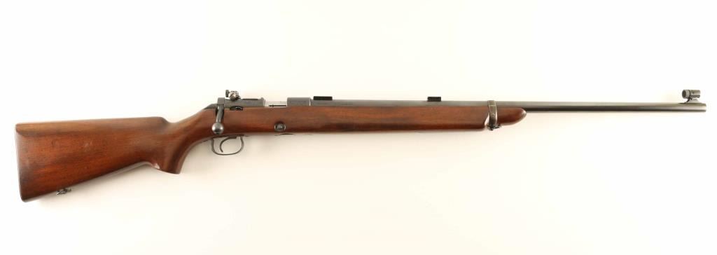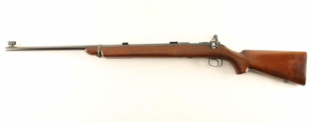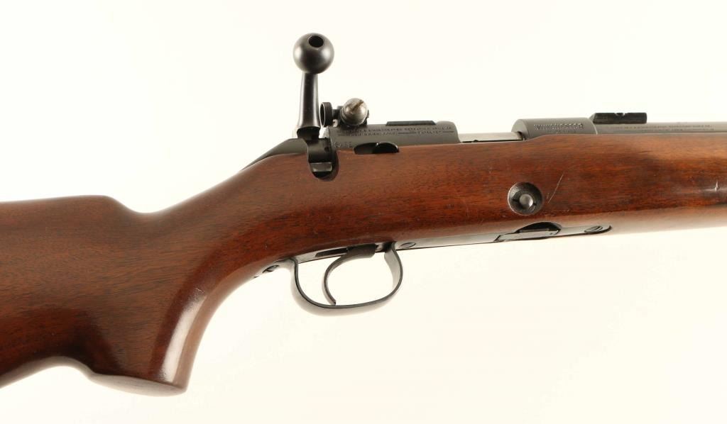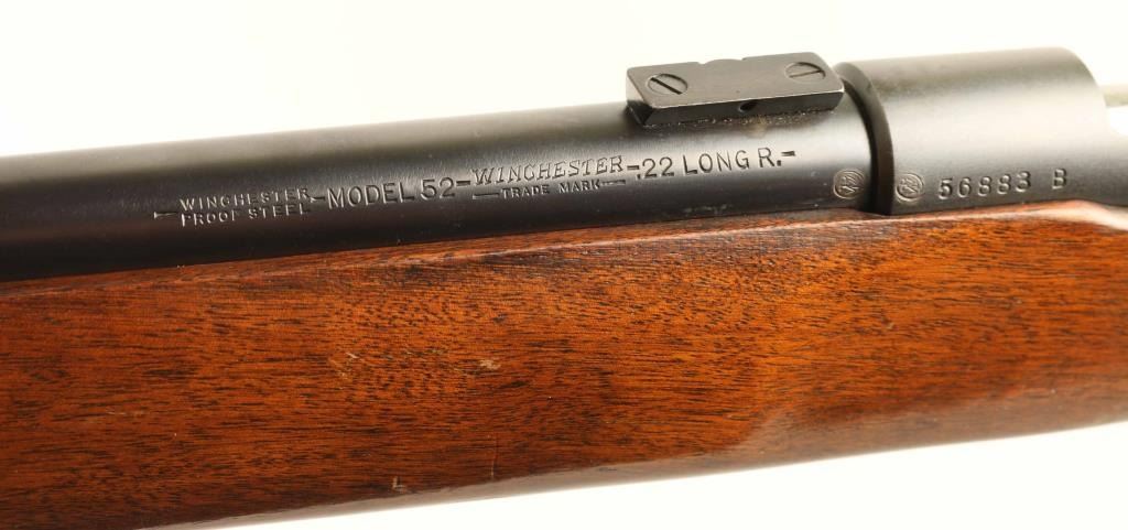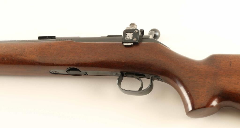 'Flat Top' Vintage magazine fed bolt action target rifle chambered in .22 Long Rifle, manufactured circa 1947. Regarded by many as one of the finest small-caliber rifles ever built. Features a blued finish, 28" barrel with installed scope blocks, Redfield globe front sight with post insert, adjustable Redfield receiver mounted aperture sight, serrated trigger, manual safety on the right side of the receiver, polished bolt, detachable 5 round factory magazine, sling swivels, and walnut pistol grip shoulder shock with inlayed accessory rail in the beavertail forend & knurled metal buttplate. Rifle retains approximately 90% of it's original blued finish showing heavy wear on the barrel band & rear sling swivel, a small amount of pin prick pitting of the barrel forward of the rear scope block and the accessory rail in the forend appearing refinished. Action is smooth, the bore is excellent, markings are sharp, and the refinished wood stock is very good+. Condition is NRA Very Good. ***C&R Firearm***