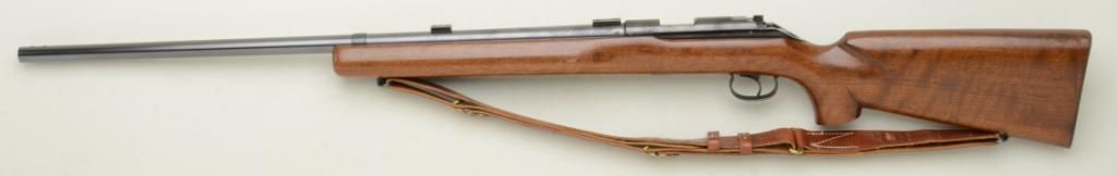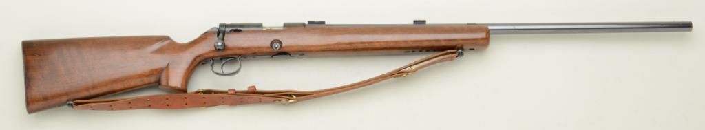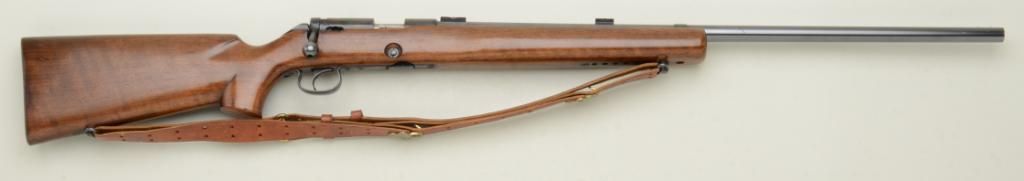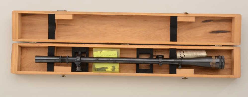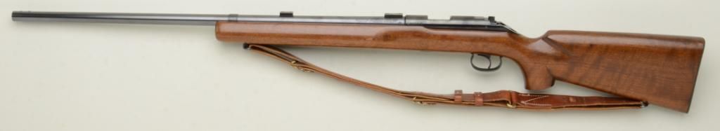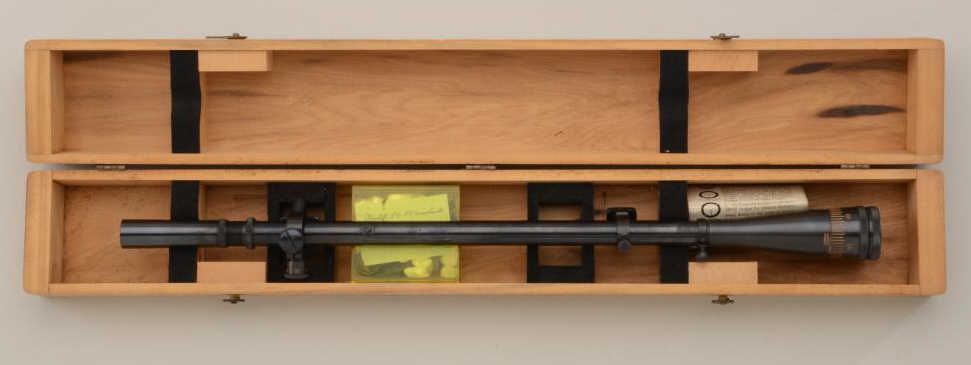 Winchester Model 52 Target bolt-action rifle, .22LR cal., 28” round barrel, blue finish, heavy wood target stock with leather sling, #100160C. This gun is in overall fine condition showing the majority of bluefinish, fine bore, action, markings and stock with scope mounts; lot is accompanied by a Lyman Targetspot long scope with fine optics and in a Lyman factory wood carry case and small plastic case of extra misc. Model 52small parts. Est.: $1,000-$1,600.
