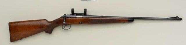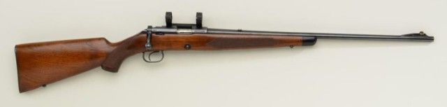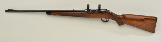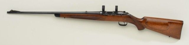 Winchester Model 52 factory Sporting (marked) bolt action rifle in 22 long rifle caliber, serial #6919xx with side mounted echo scope mount secured by three tap holes and screws into right side of action for 1" scope. Therifle remains in very good condition showing 85-95% original blue, wood shows normal use and minor imperfections. No clip and no sling swivels. Theses sporting models are becoming very desirable to collectors.Robert I Petersen collection. Est.; $700-$1,400.