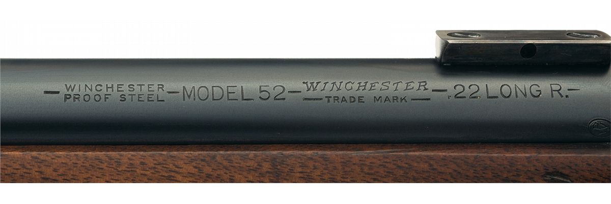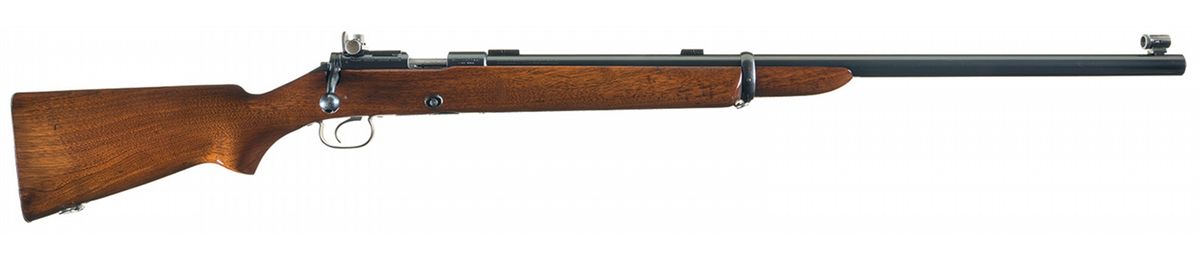 Manufactured in 1938. There is a dovetail mounted Lyman Globe style front sight at the muzzle, there are two scope blocks near the breech end of the heavy barrel and there is a fully adjustable Lyman peep sight mounted in the receiver dovetail. The right side of the receiver is stamped with Winchester and patent markings. The left side of the barrel and receiver are stamped with the "W/P" in an oval proofmark. Mounted on a smooth walnut pistol grip stock with a checkered steel buttplate.