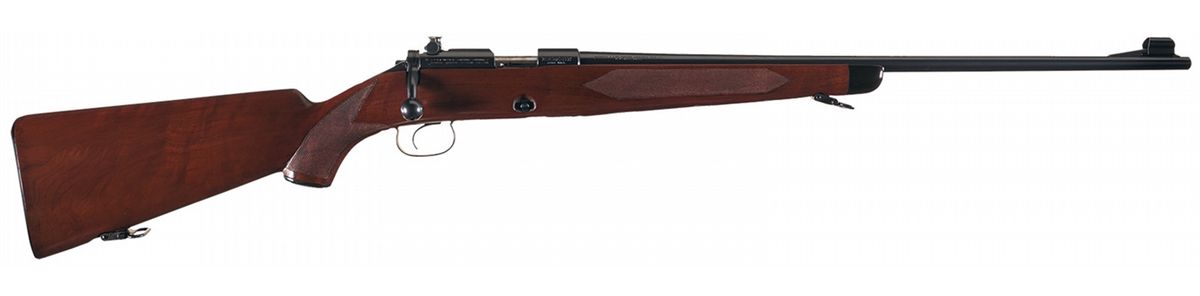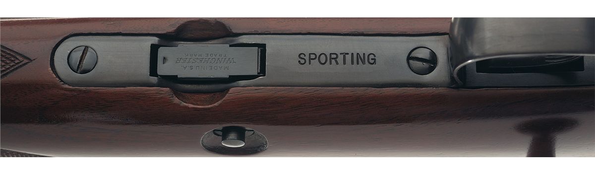 Manufactured in 1938. It is chambered in the rarely seen 22 Short caliber. Hooded ramp front sight and Lyman receiver sight (stock inletted) with the Winchester factory oval proof stamped on the left side of the barrel and receiver at the breech and "SPORTING" marked in front of the trigger guard. The pistol grip stock has checkering on the forearm and grip area, forend tip, factory hard rubber grip cap, cheekpiece, quick release sling swivels and checkered steel buttplate.