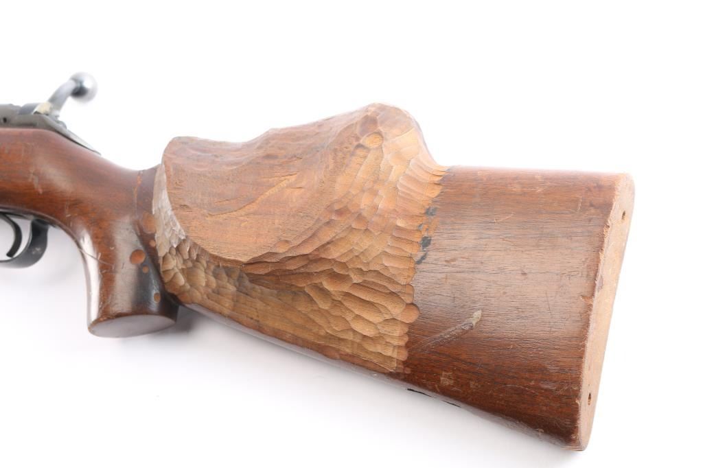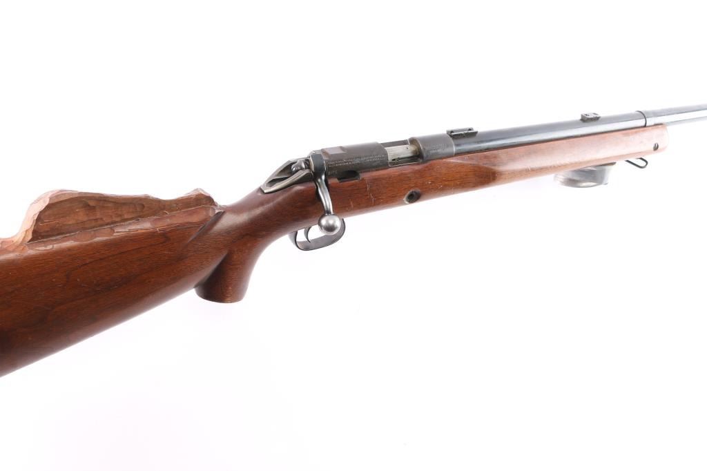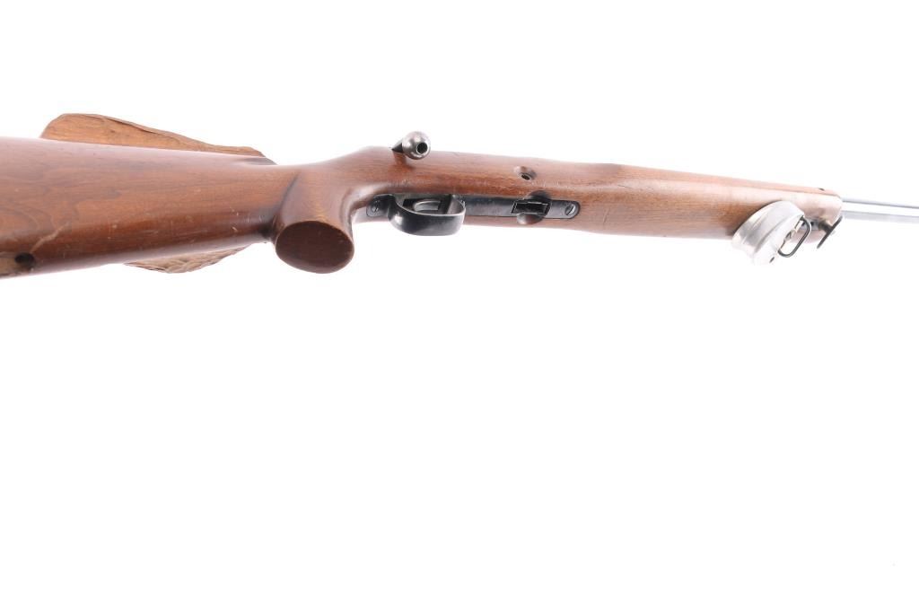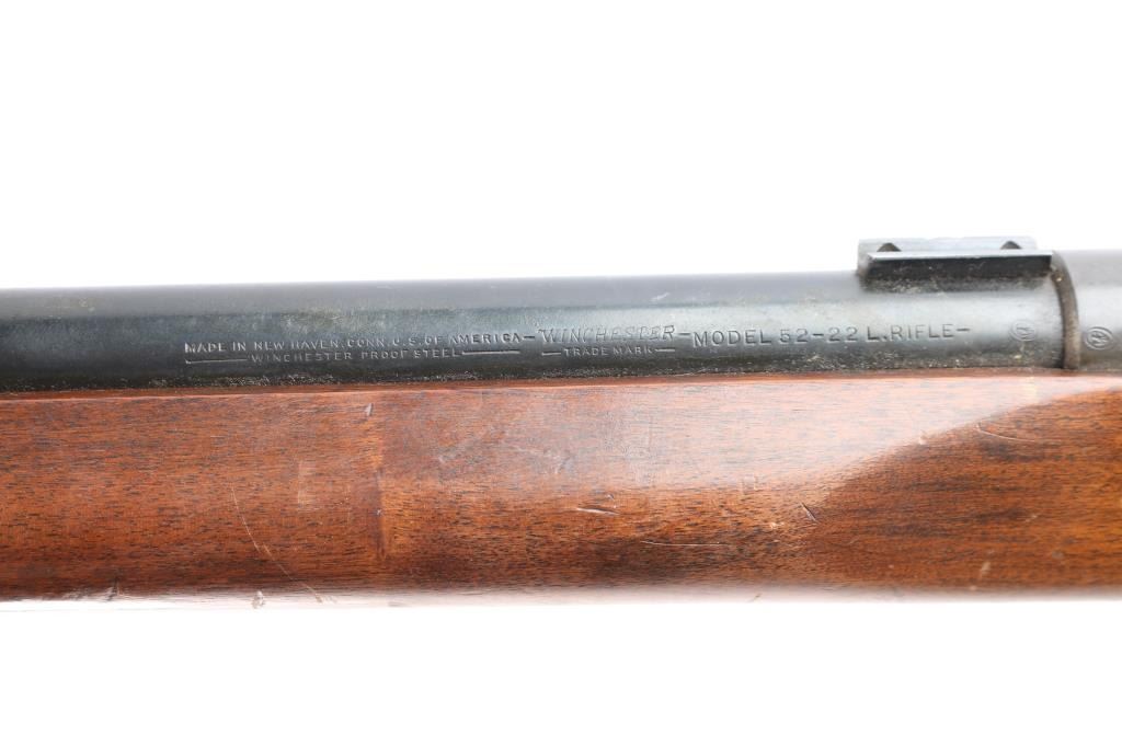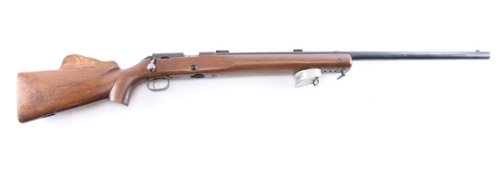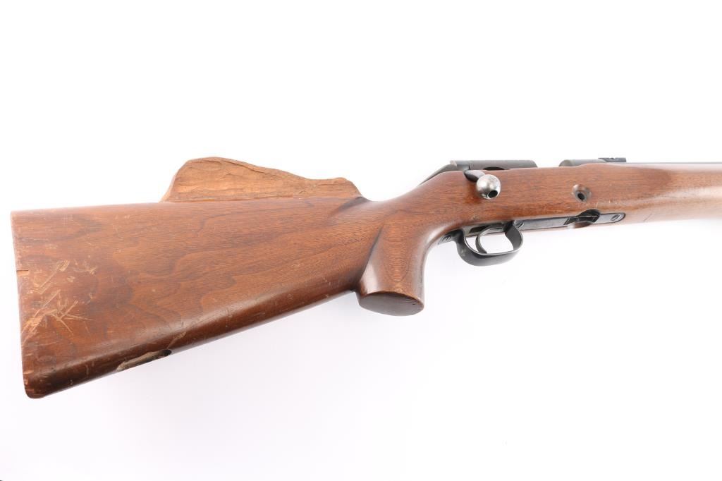 Vintage magazine fed bolt action target rifle chambered in .22 Long Rifle, manufactured circa 1940 in New Haven, CT. Regarded by many as one of the finest small-caliber rifles ever built. It features a blued finish, 28" barrel with installed scope blocks, iron sights removed for optics (installed slot blank in front), curved serrated trigger, manual safety on the right side of the receiver has been removed, polished bolt body, accepts detachable 5 round factory magazine (included magazine has been converted to single shot), front sling swivel, and rear sling swivel removed. The furniture is a customized walnut semi-pistol grip shoulder stock with inlayed accessory rail in the beavertail forend, and buttplate removed. Rifle retains approximately 92% of it's original blued finish showing only superficial scratches on the barrel and receiver with most of the finish wear on the trigger guard. The bore appears bright with strong riflling. Action is smooth, and the markings are clear. The wood stock is marginal because it is missing parts, and it was in the middle of customization. The magazine release button is missing, but an object that fits into the hole can release the magazine. It includes an aluminum hand stop on the accessory rail.