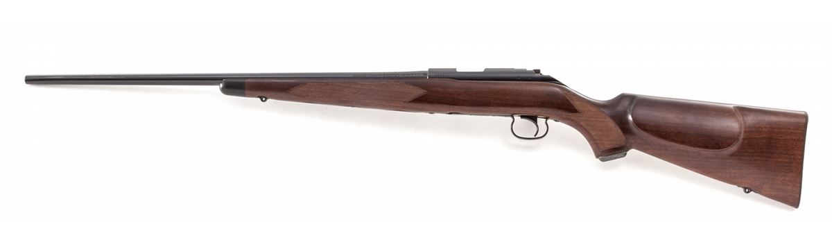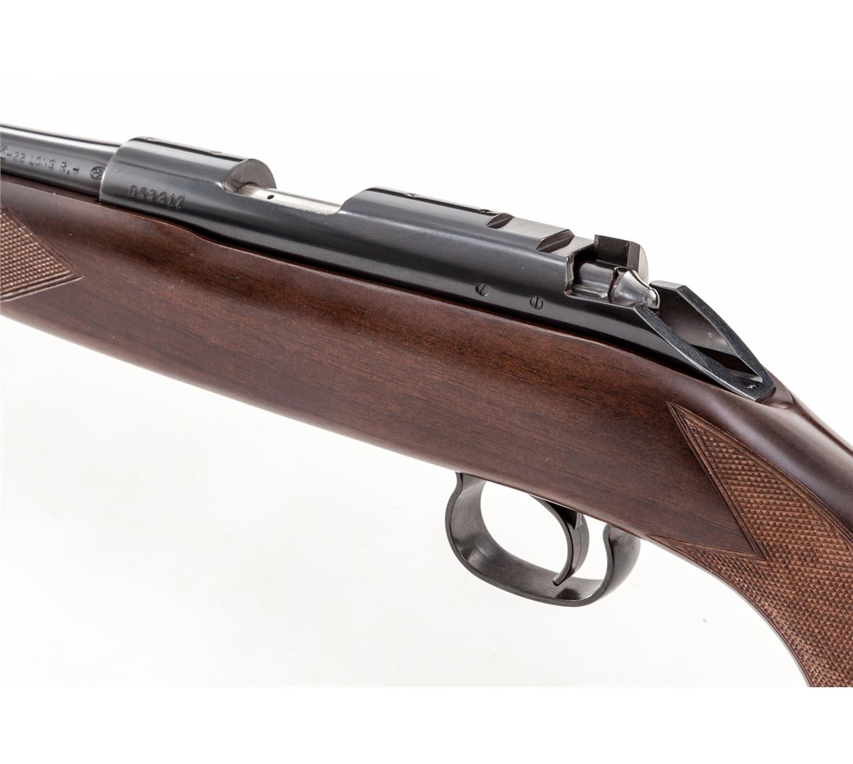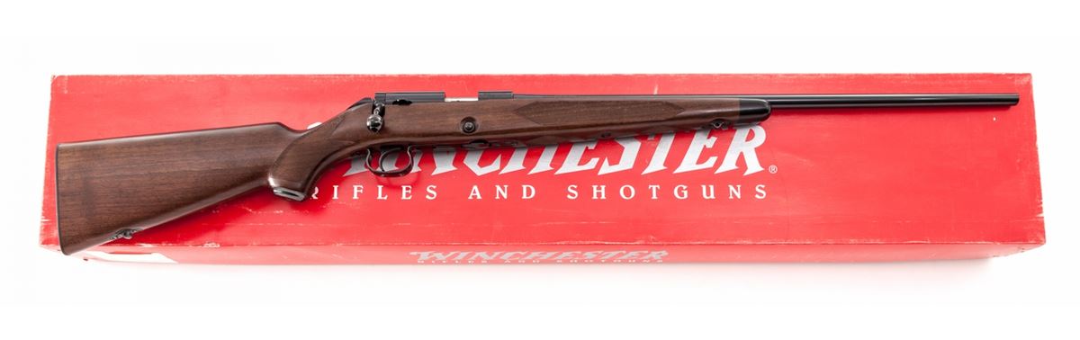 Winchester Model 52B Bolt Action Rifle, #BS3217, .22 L.R. cal., 24'' barrel, blue finish, checkered pistol grip wood stock with ebony forend tip, metal Winchester buttplate, adjustable trigger, and one magazine, in red Winchester box with matching end label. Mfg'd between 1993-2002 by Miroku, Japan. Condition is excellent, appearing near new. Stock with a few light marks from handling. Appears to have been fired very few times. Est.: $500-$800. (Modern)
