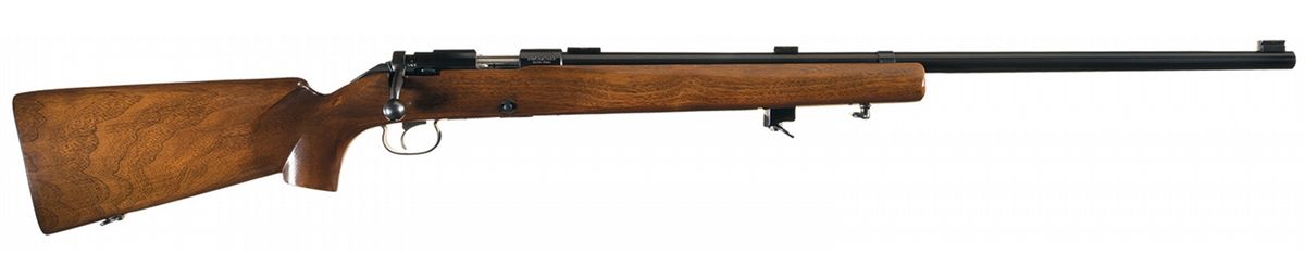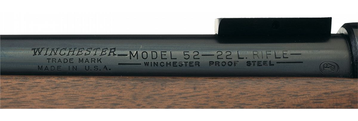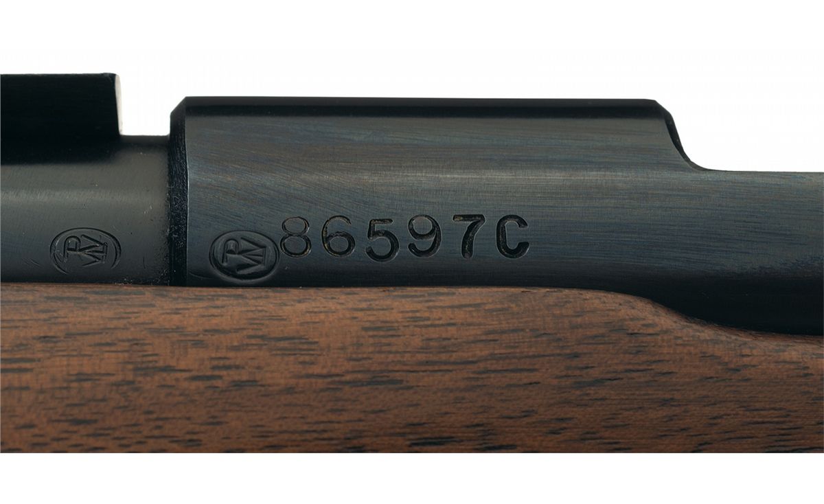 Manufactured in 1956. There is one sight/scope block mounted at the muzzle and two towards the rear of the barrel. The left rear is factory tapped for sight mounting. The left side of the barrel and receiver are stamped with the oval "W/P" proofmark. Mounted on a smooth walnut pistol grip stock with an accessory rail on the forearm having a palm stop/sling swivel installed and a checkered steel buttplate. Small NRA pin in forearm face.