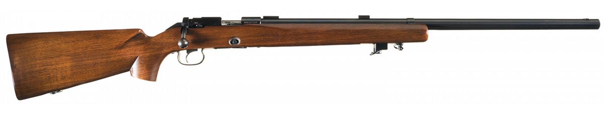 Manufactured in 1955. There is a blank installed in the muzzle dovetail, there are two scope blocks mounted towards the rear of the heavy barrel and the left rear of the receiver is factory tapped for sight mounting with filler screws installed. The barrel is stamped with a short inscription towards the breech end of the barrel. The oval "W/P" proofmark is stamped on the lower left front of the receiver and lower left rear of the barrel. Mounted on a smooth walnut pistol grip stock with an accessory rail in the forend having a plastic palm stop/sling swivel installed and a checkered steel buttplate. The magazine is absent with a single shot adaptor installed.