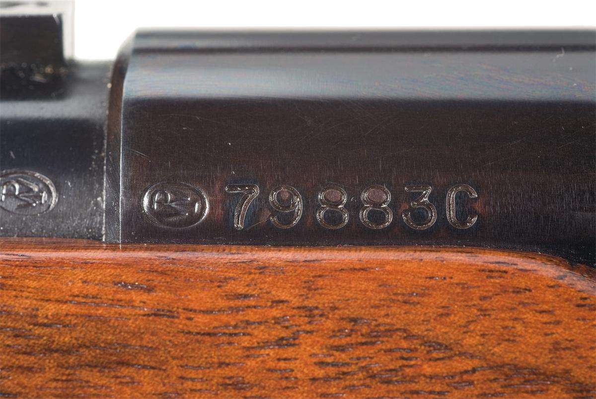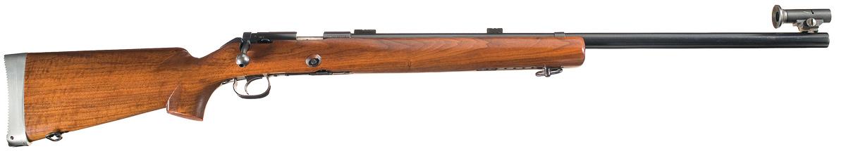 Manufactured in 1954. Has an extra heavy barrel fitted with a globe front sight (no insert) and two scope bases, along with the standard markings on the left side near the breech. Receiver is drilled and tapped for base mounting on the left side, with a screw adjustable serrated trigger. Smooth pistol grip stock with a seven position adjustable front sling swivel, fixed rear sling swivel and a serrated adjustable alloy M.H.Canjar buttplate with fold-down Swiss hook.