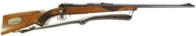 bolt action rifle, blued with checkered pistol grip stock with presentation blank plate. Barrel and receiver retains 75% of original blue, correct sights intact, pistol grip buttstock very good retaining original metal buttplate. Sling swivels intact with sling. Tight action and bore good. Modern. Est. 600-900