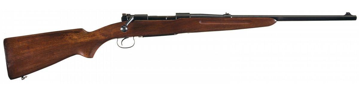 Manufactured in 1929. Has a brass beaded blade front sight and a fixed rear sight with 1 flip up blade. The front receiver ring is factory tapped for a scope base. The blue bolt is numbered to the gun. Mounted on a smooth walnut pistol grip stock with grasping grooves and a serrated steel buttplate.