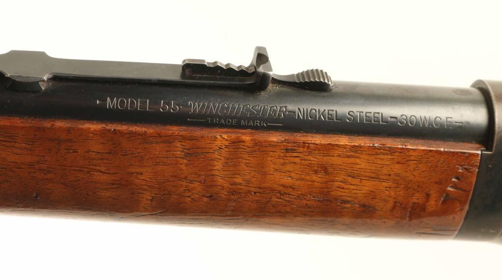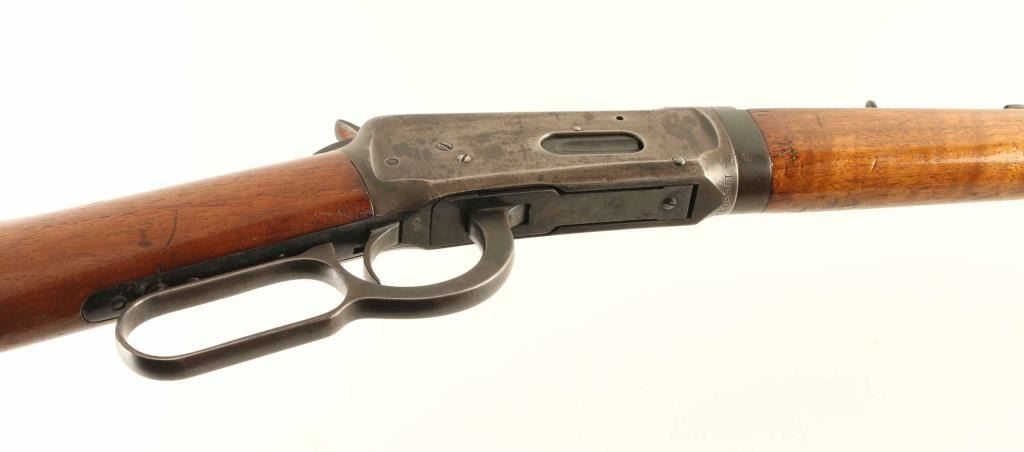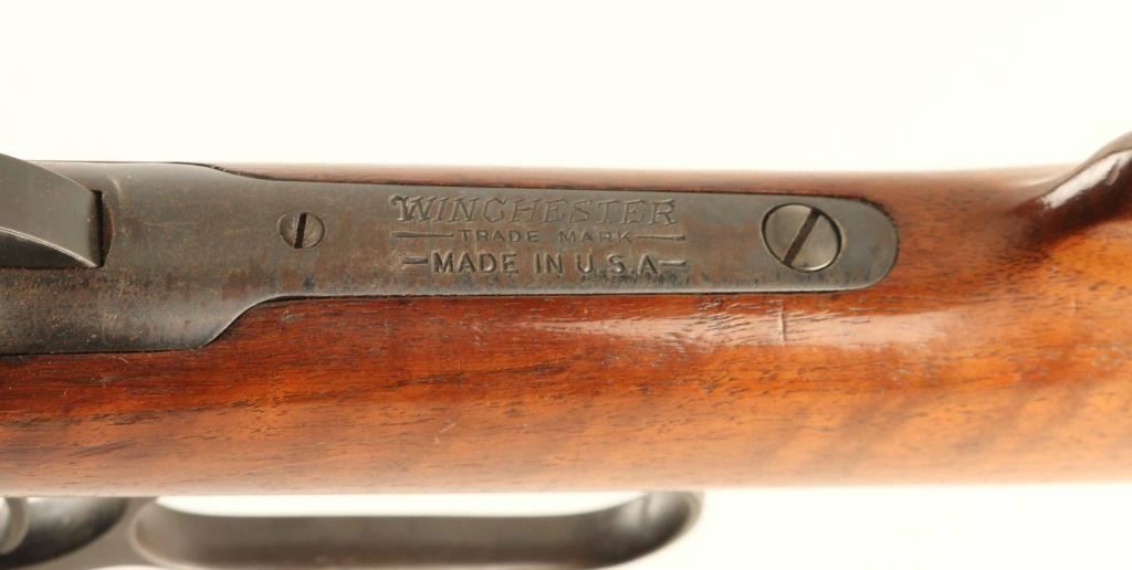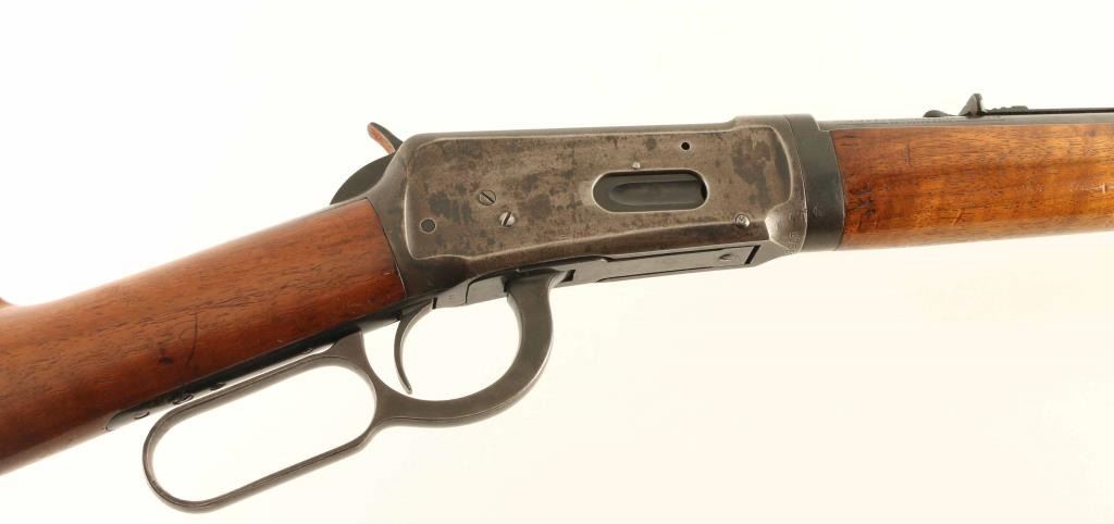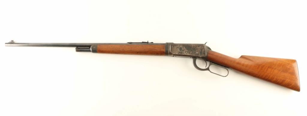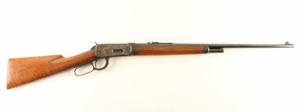 'Take-Down' rifle manufactured circa 1927. Features 24" barrel, 2/3 length magazine tube, take down lever at magazine cap, buckhorn sights, straight grip, shotgun butt with grooved steel buttplate, highly figured walnut stock with fiddleback grain. Bore is very good condition. Retains 50% blued finish with scratches & scuffs, mostly dark blue on barrel, mottled gray & brown color on receiver., bare metal at some sharp edges. Wood is very good condition, appears refinished with dents & discoloration present under varnish, good fit to metal. Action operates smoothly. Markings are crisp. Condition is NRA Good++ refinished wood *** C&R Firearm ****