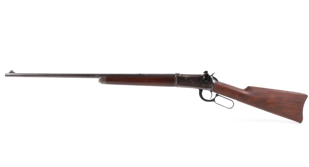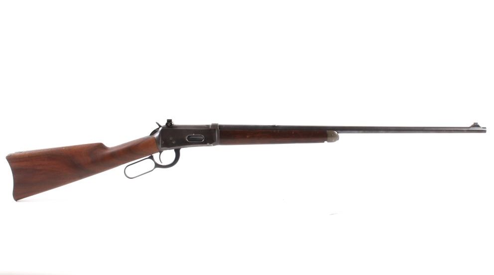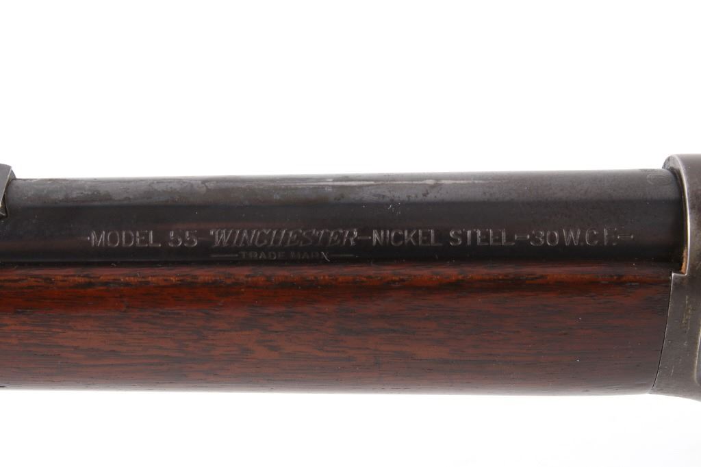 Included in this lot is an extremely rare, limited production Winchester Model 55 lever action rifle in desirable .30 WCF (.30-30 Winchester) caliber. The Model 55 was designed to be an “up-dated” version of the famed Model 1894 rifle. It was made with a 24” round barrel, half magazine and typically a shotgun butt plate. The Model 55 was mainly produced in very small annual numbers from 1924 - 1932 (along with manufacture of the standard Model 1894) with a few more produced during the worst of the Great Depression (when sales were exceptionally slow) into 1935. After 1935 a very few more Model 55s were produced from left over parts with almost all being completed by 1936. This very late and unusual example with serial number 1167382 was made in 1938, two years AFTER assembly of parts were supposed to be exhausted! This rifle may be the very LAST Model 55 ever put together by Winchester! Further, it is fitted with a non-standard carbine style butt stock and butt plate which may indicate that all Model 55 parts were collected for this last rifle except a butt stock so it was fitted with a carbine butt stock to complete the rifle. The barrel retains excellent blue with correct and sharp “MODEL 55 – WINCHESTER – NICKEL STEEL – 30 WCF -” markings. The upper tang also shows sharp and correct Winchester markings. The barrel is also fitted with the correct short ramp front sight with dovetailed blade/bead while the receiver is fitted with a receiver fully adjustable aperture sight. The receiver also retains fine lightly aged blue with excellent screw heads and bright blue on the bolt and loading gate. The walnut forearm and butt stock show only the lightest of handling. The bore is bright and minty with sharp rifling throughout. With only 20,580 Model 55s produced in 8-10 years, surviving examples in any condition are scarce. This is a most unusual Model 55 and very well could represent the last in the line that was discontinued because of the Great Depression and later World War II. Certainly, one of the better and more unusual of the entire Winchester Lever Action line of rifles, the Model 55 remains a very desirable Winchester collectable. This firearm qualifies as a Curio & Relic, and requires FFL Transfer or NICS Background Check.