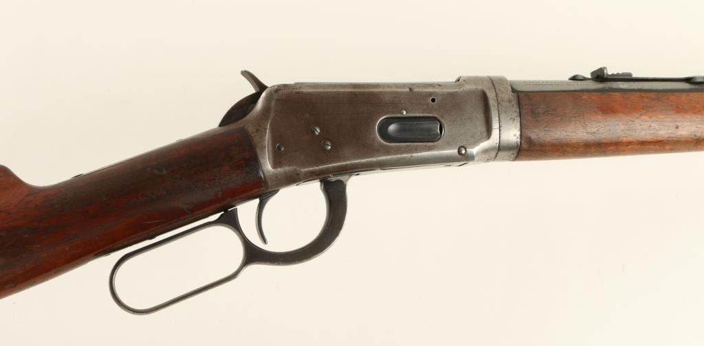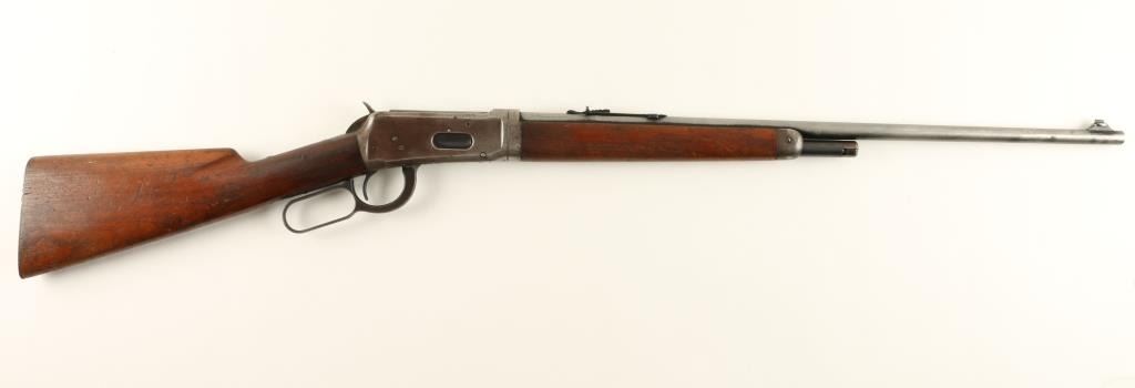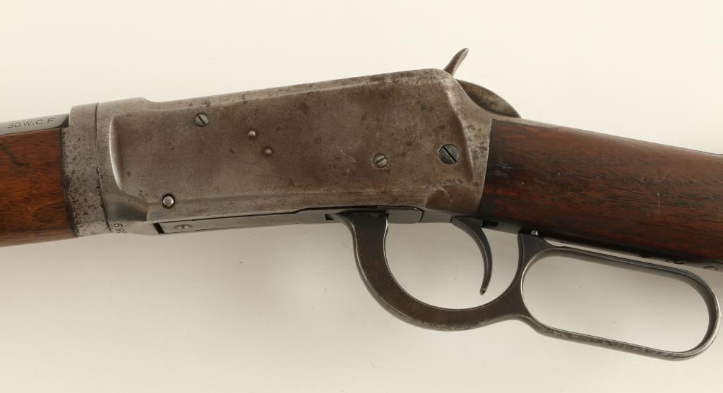 Winchester Model 55 takedown lever action rifle, .30 WCF cal., serial #11359. The rifle is in overall good condition with a rare 24” stainless steel marked barrel with a Lyman front and adjustable rear sights. The barrel retainsapproximately 10% of its flaking black finish. The receiver has gone to patina with light surface rust evident. The smooth wood stocks are in overall good condition with small mars and loss of finish consistent with use. The butt stock endswith a checkered steel butt plate. The bore is excellent, the action crisp and markings sharp on this desirable Model 55. A rarely seen Model 55 with a stainless steel barrel. (C+R) Est.: $1,400-$2,800.