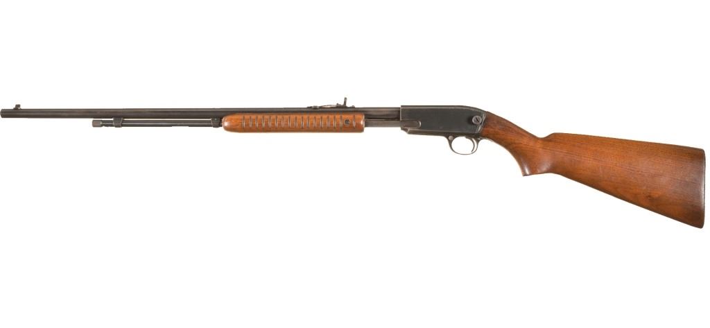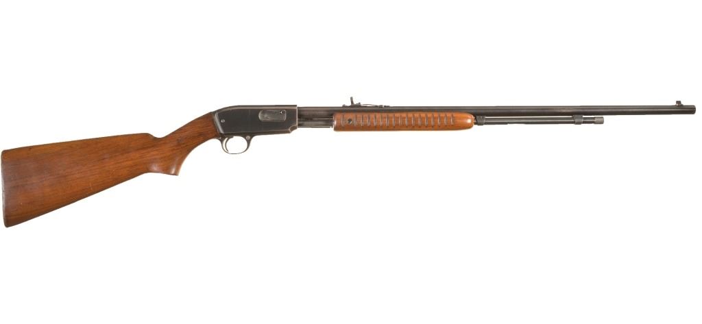 Included in this lot is a Winchester Model 61 .22 slide action take down rifle. This rifle utilizes a 24” round blue’d barrel chambered in .22 Short, Long and Long Rifle. The factory finish to the barrel, frame and magazine tube show very little wear. The take down screw on the left of the frame allows the rifle to be broken down into two pieces. The left of the barrel reads “WINCHESTER TRADE MARK MADE IN U.S.A. – MODEL 61 .22 S.L. OR L.R.” The walnut foregrip and stock show good condition with only small dents and dings from storage and use. The shotgun style but pad is checkered. The serial number indicates a manufacture date of 1948. Serial Number: 99069. This firearm qualifies as a Curio & Relic, and requires FFL Transfer or NICS Background Check.