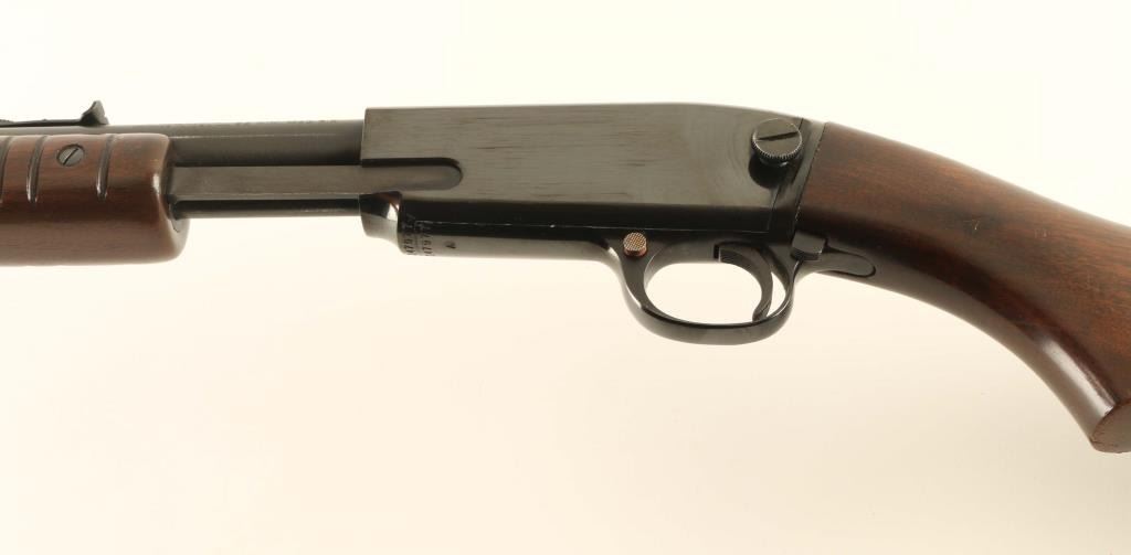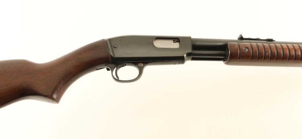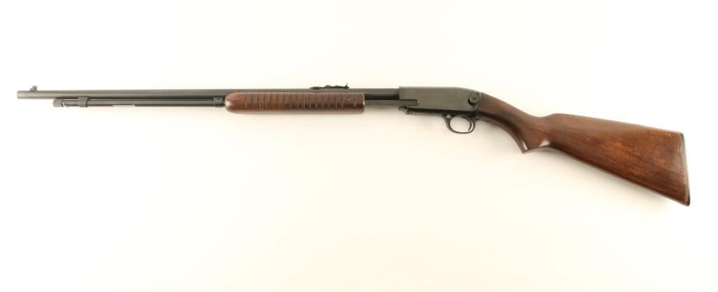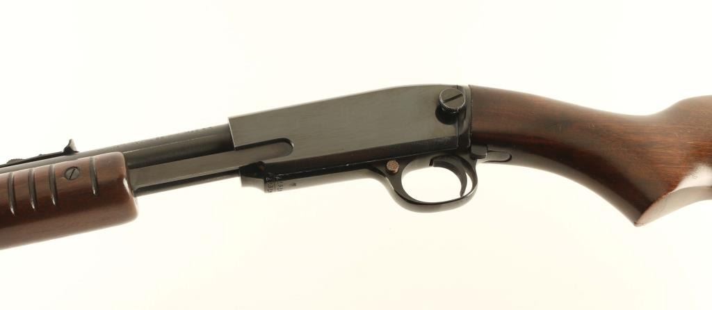 'Late Production Third Variation' Vintage slide action repeating rifle chambered in .22 Magnum, manufactured in New Haven, CT circa 1963. Features a blued finish, 24" round barrel, 7/8 length tube magazine, dovetailed blade front sight with silver bead, elevation adjustable rear sporting sight, take-down receiver with integral scope rail cuts, serrated trigger, push button safety, 8 3/8” grooved walnut slide handle and smooth semi-pistol grip shoulder stock with factory black hard rubber buttplate & 13.5” LOP. Rifle retains approximately 95% of its blued finish showing some scattered scratches, a light amount of pin prick pitting and slide wear on the magazine tube & barrel. Action is crisp, the bore is excellent and wood stocks are good as slightly oversized with blemishes & finish loss. Condition is near NRA Very Good. ***C&R Firearm***
