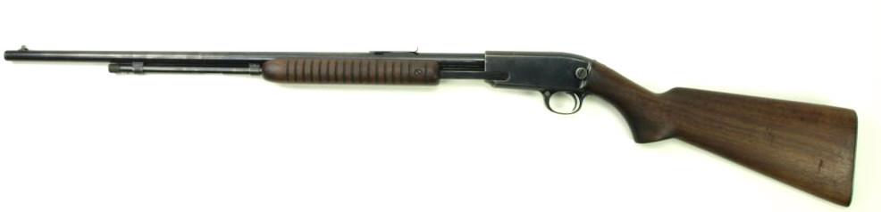 pump action rifle with 24" barrel and walnut stocks. Rifle remains in good overall condition, top of receiver shows 2 tapped and plugged holes, barrel retains approx. 85% original blue thinning at muzzle end and forward of rear sight, walnut