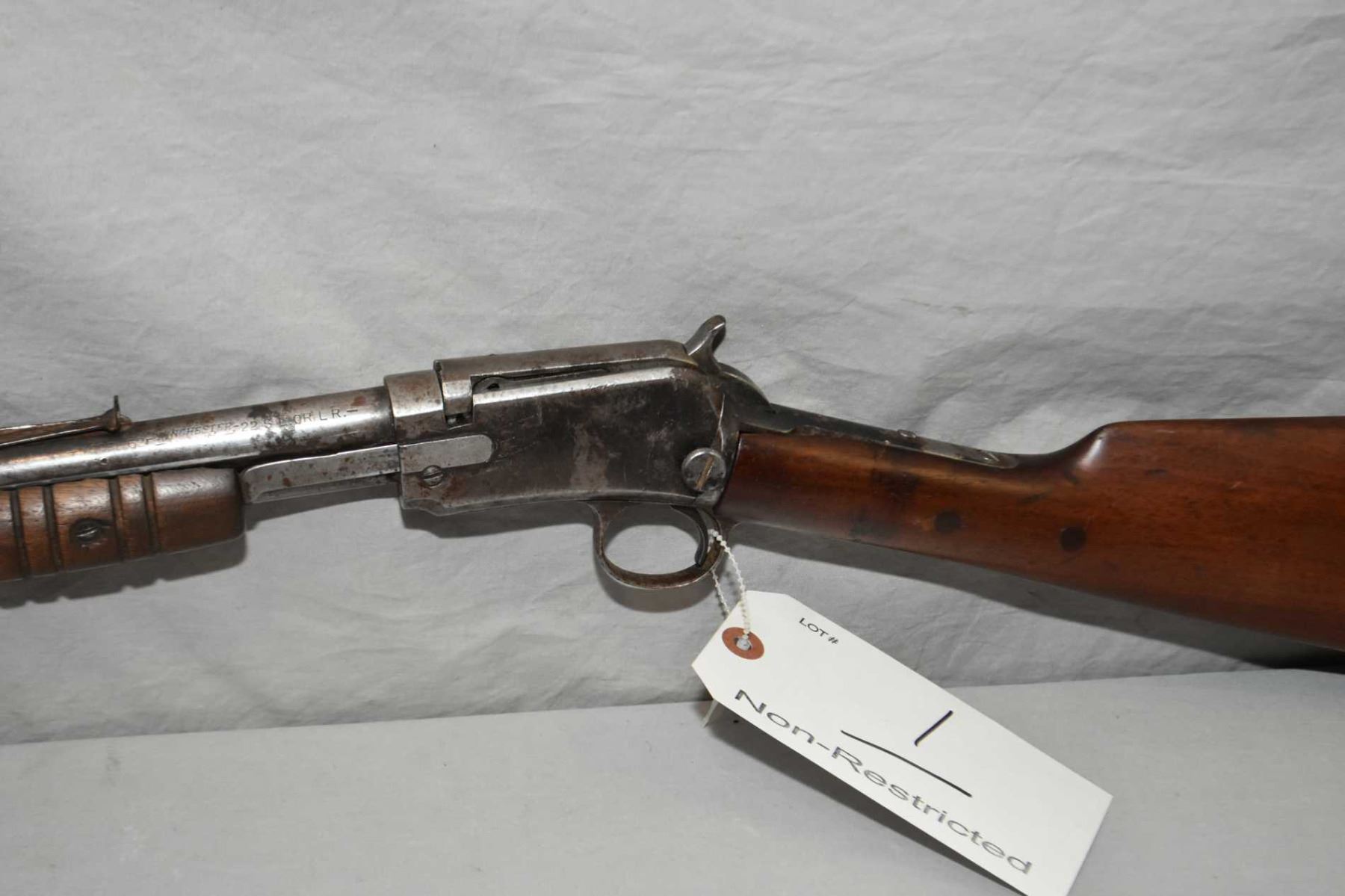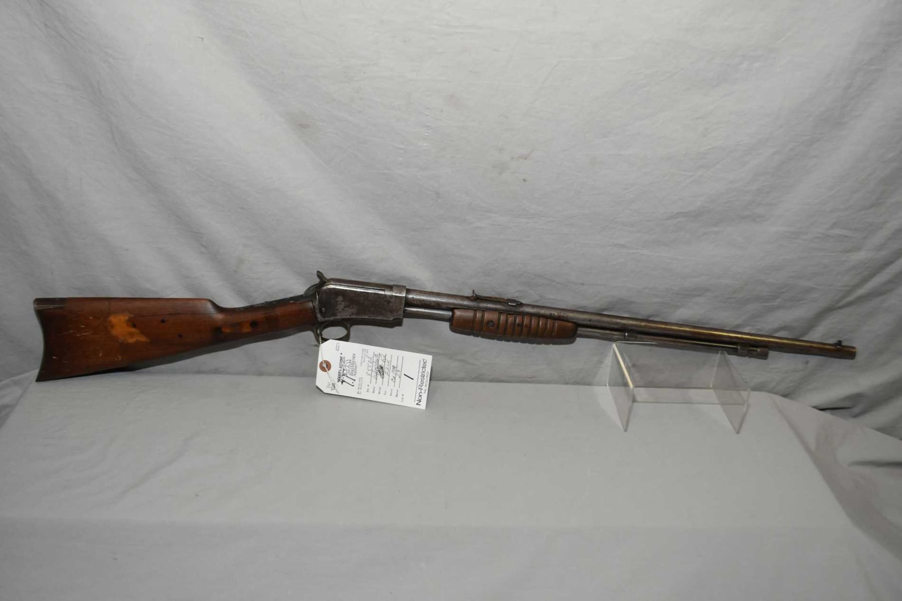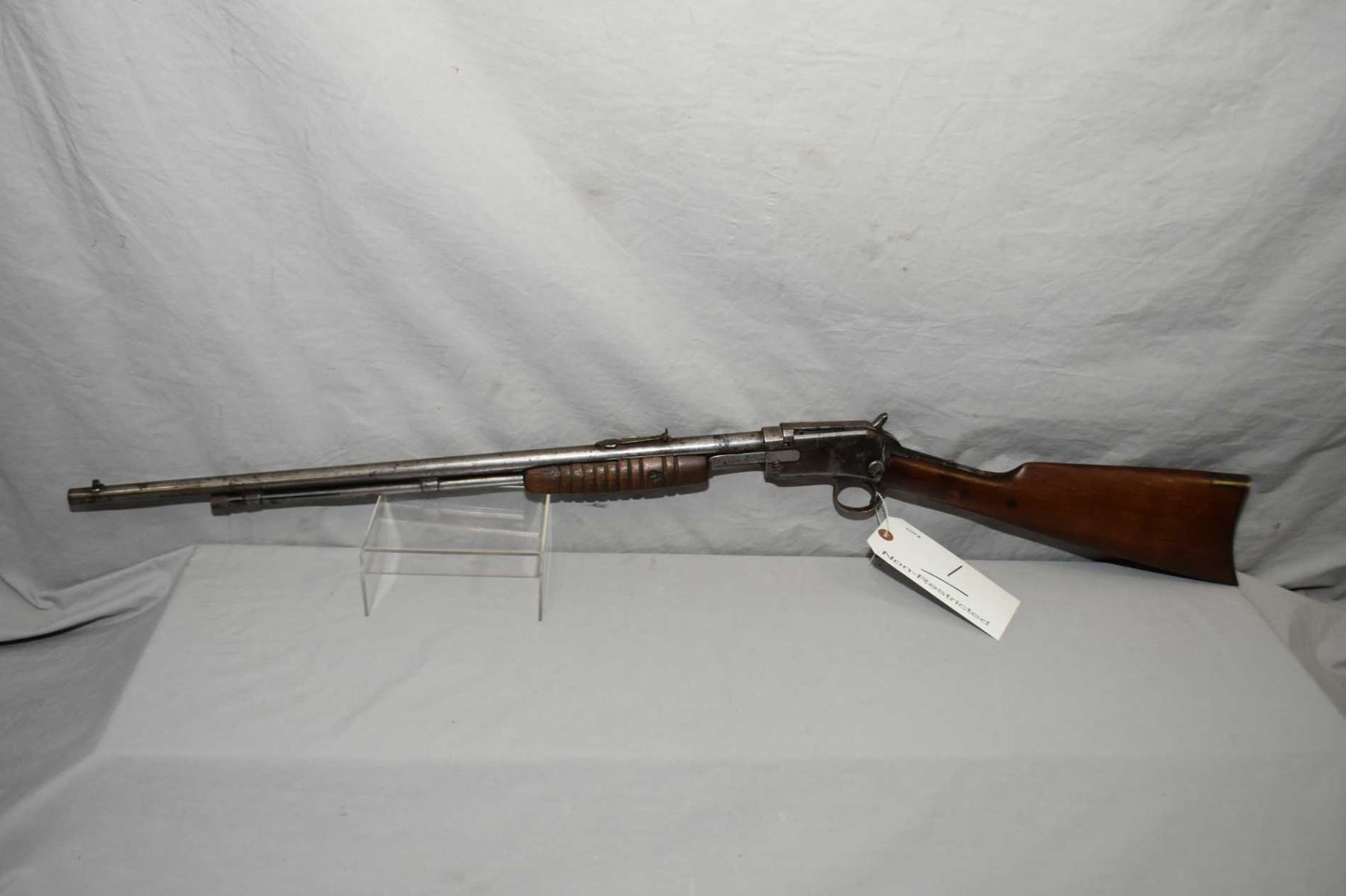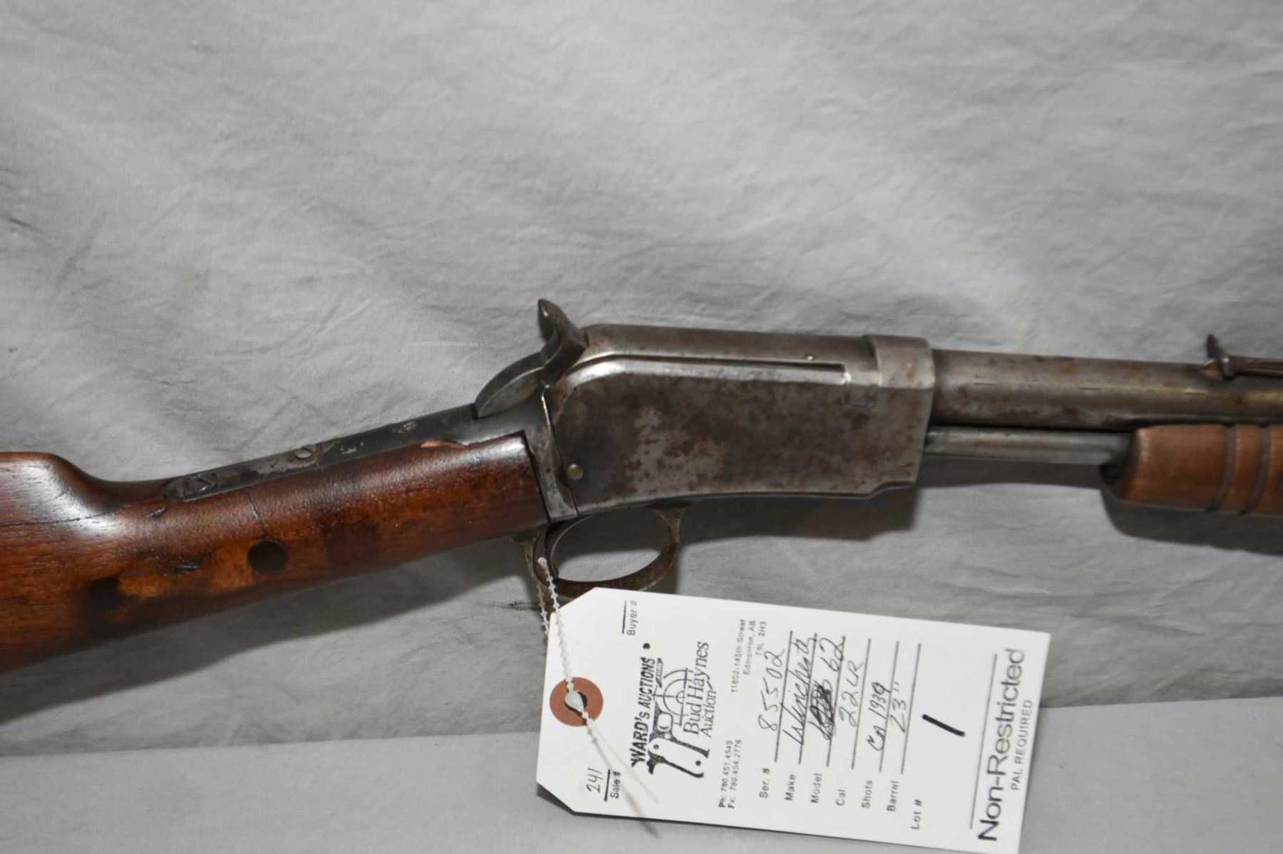 Winchester Model 62 .22 LR Cal Tube Fed Pump Action Rifle w/ 23" bbl [ traces of blue in protected areas, faded to a patchy grey, grooved forewood has various marks, small chips, etc. and slight crack, stock was broken and repaired thru wrist with filler on right side, metal crescent style butt plate, Circa 1939 ] Ser # 85502