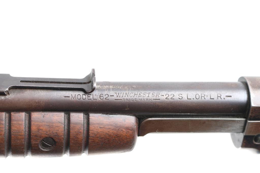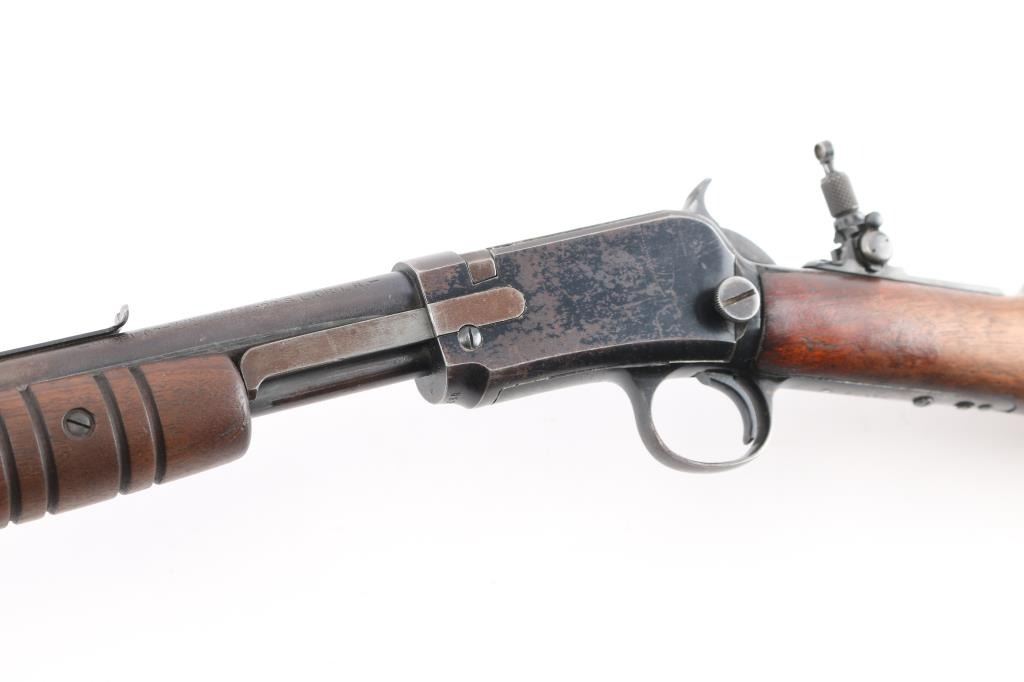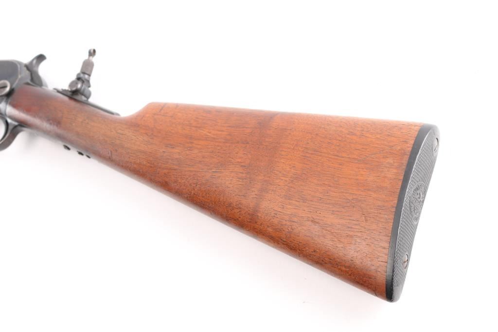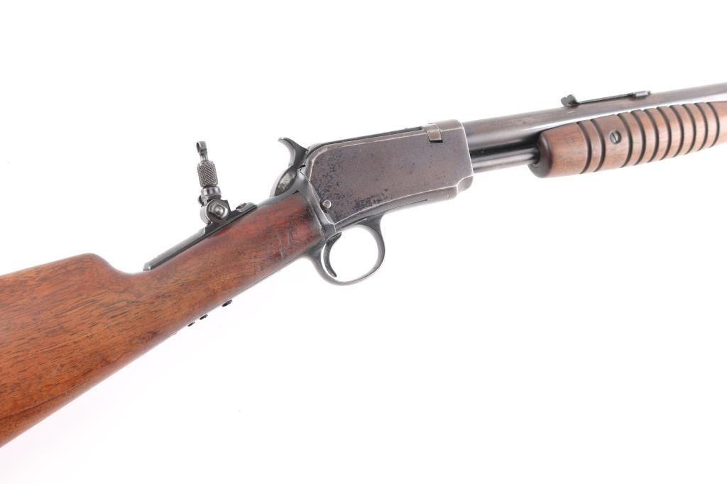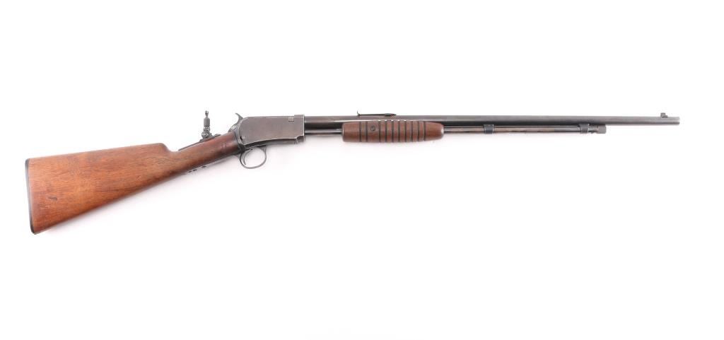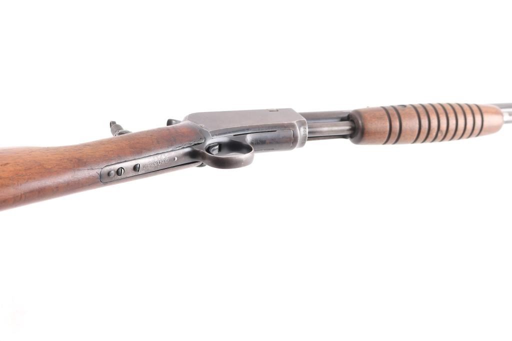 Pump action rifle manufactured circa 1937. Features blued finish, straight gripped wood stock, grooved pump handle, factory buttplate, 23" barrel, blade/bead front & sporting rear sights, magazine tube under barrel, exposed hammer, takedown screw on left side of receiver. Lyman adjustable peep sight installed on tang. Bore is excellent/bright. Retains about 50% blue, scattered pin-prick pitting, mostly dark & even with light patina on receiver sides and spots on magazine, edge losses & scratches. Wood is overall good condition, with a small chip out of the left upper wrist, and a minor crack on the left upper wrist, serial number on lower tang matches receiver. Two screws are proud of the lower tang and appear to be replacements.