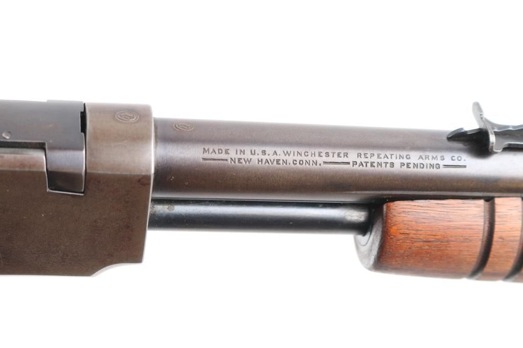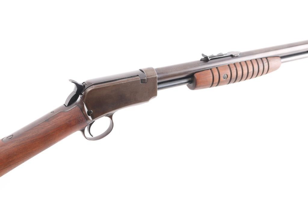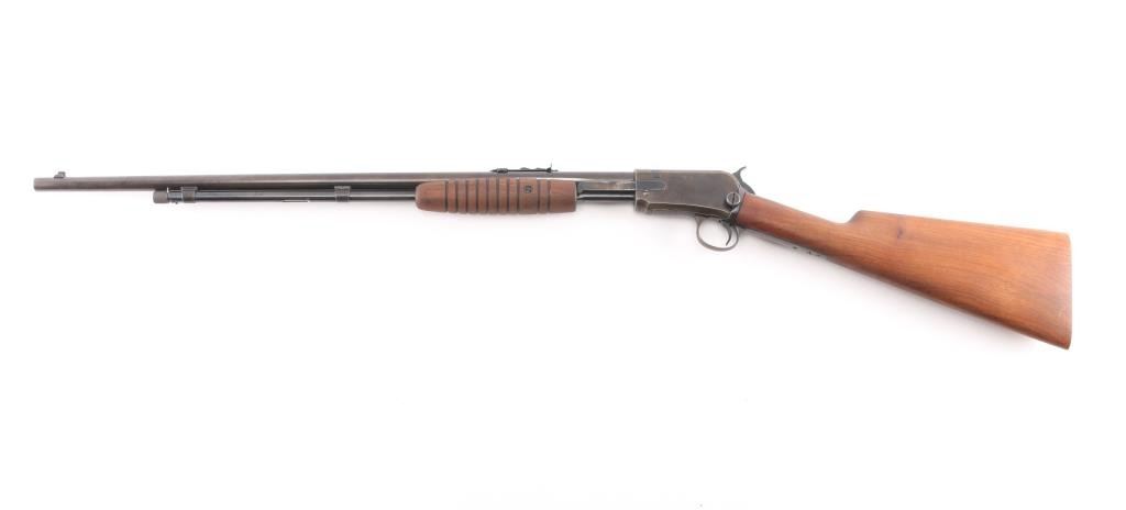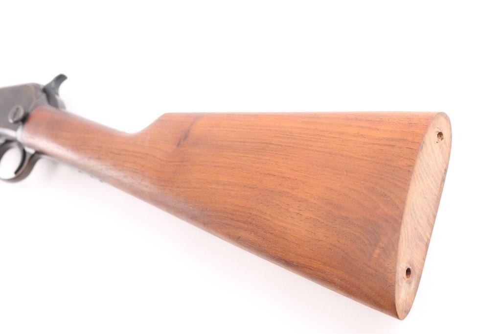Slide action rimfire rifle manufactured circa 1938. It has a 23" blued barrel and receiver, dovetailed front sight, adjustable rear, 3/4 length magazine tube, smooth trigger, knurled hammer spur and takedown screw on the left of the receiver. Two piece wood stocks are a smooth shoulder stock, and a grooved slide handle the wood stocks are newer replacements with no buttplate, excellent condition. Bore is excellent/bright, action is smooth, blued finish is about 60%with the barrel, receiver, and tangs starting to turn a brown patina from handling, some minor scratches.