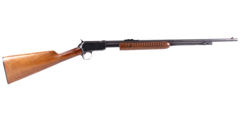 Included in this lot is a Winchester Model 62 .22 caliber slide action rifle. This rifle has a manufacture date of 1946. The Model 62 replaced the Model 1906. This takedown rifle is chambered in .22 caliber (the rifle can fire short, long or long rifle). The rifle utilizes a 23" round blue'd barrel with fixed blade front sight and adjustable ladder rear sight. The left side of the barrel is marked "Made in New Haven, Conn. U.S. of America - Winchester Trade Mark - Model 62 - S.L. or L.R." The straight grain walnut stock and fore grip are in good condition. The stock shows minor compression marks from use. The gun is in good mechanical condition but remains untested. Serial Number: 181108. This firearm qualifies as a Curio & Relic, and requires FFL Transfer or NICS Background Check.