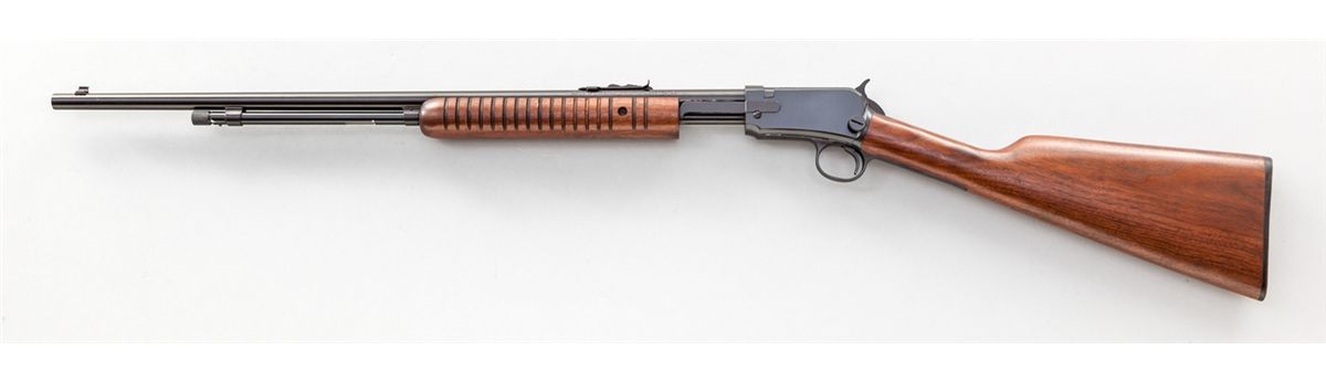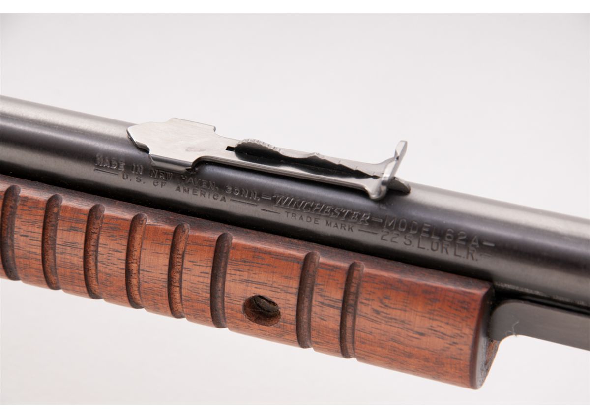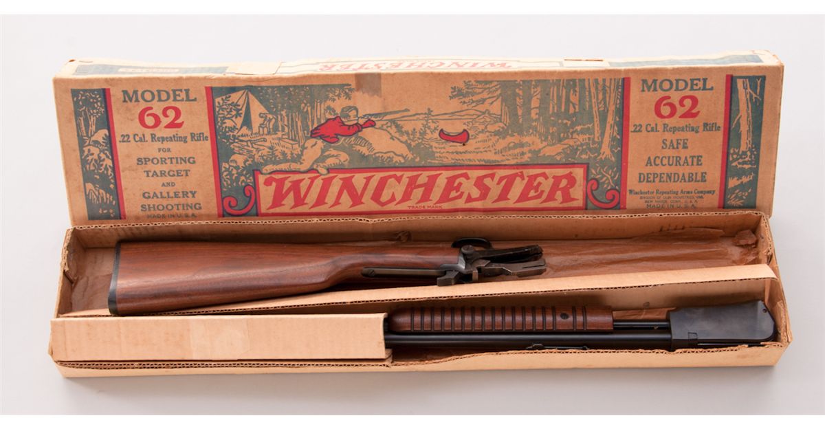 Winchester Model 62 Slide-Action Rifle, #268015, .22 SL&LR cal., 23'' barrel, blue finish, walnut stocks, in original box. Mfg'd 1950. Condition is as new with near imperceptible marks from handling. Multi-colored box with very light water damage. Est.: $2,000-$3,000. (C&R)