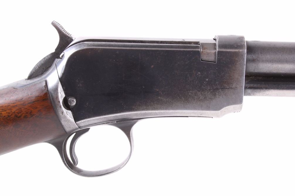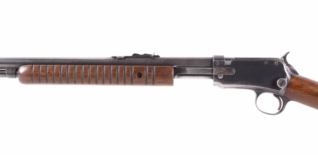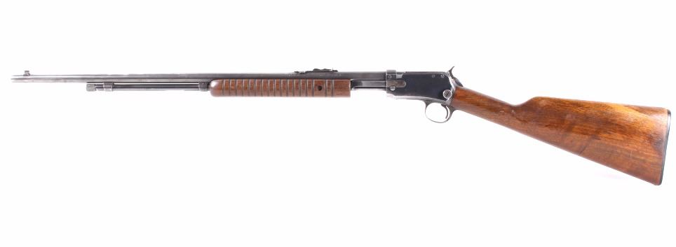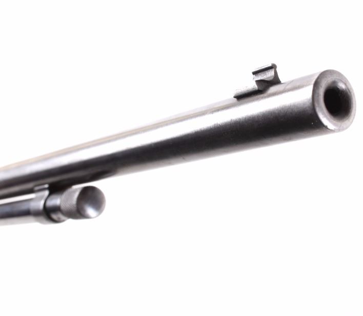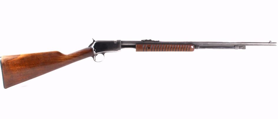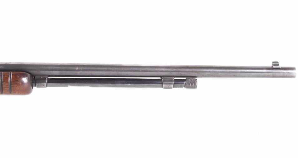 This is a Winchester Model 62A .22 LR takedown pump action rifle. The rifle features a blued steel finish, straight walnut stock and slide handle, exposed hammer, 23" tapered round barrel, and tube magazine. The Winchester model 62 and 62A was a rifle that many people grew up with, leading it to be a very popular rifle. Winchester Model 62 and later the 62A, can last a lifetime. They were the .22 galley gun used in carnival shooting galleries for years and were often fired hundreds of times a day, thousands of times a week, year after year. The Winchester model 62 is also very accurate and about as reliable as .22 rifles can get. The rifle shows good condition, with loss of bluing along the barrel and receiver. The wood is in good condition with great color, but does show handling marks and wear. The rifle was manufactured in 1955. Curio & Relics rifle. FFL transfer or NICS background check required. Serial number is 342375. The overall length is 39 1/2"