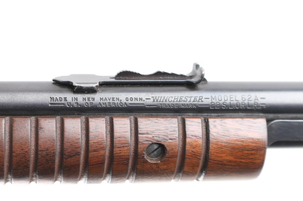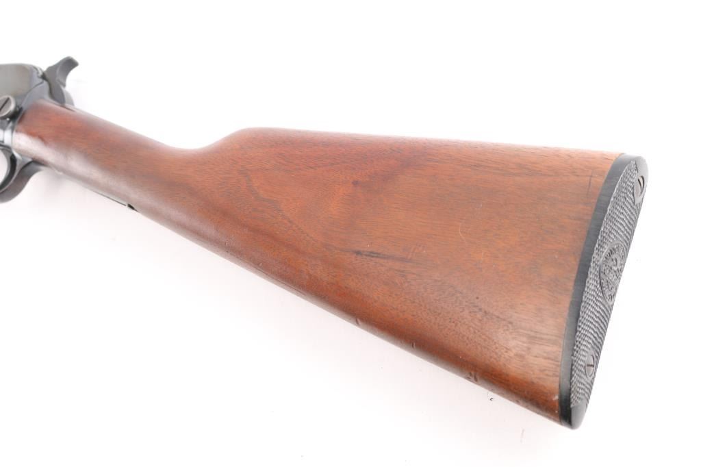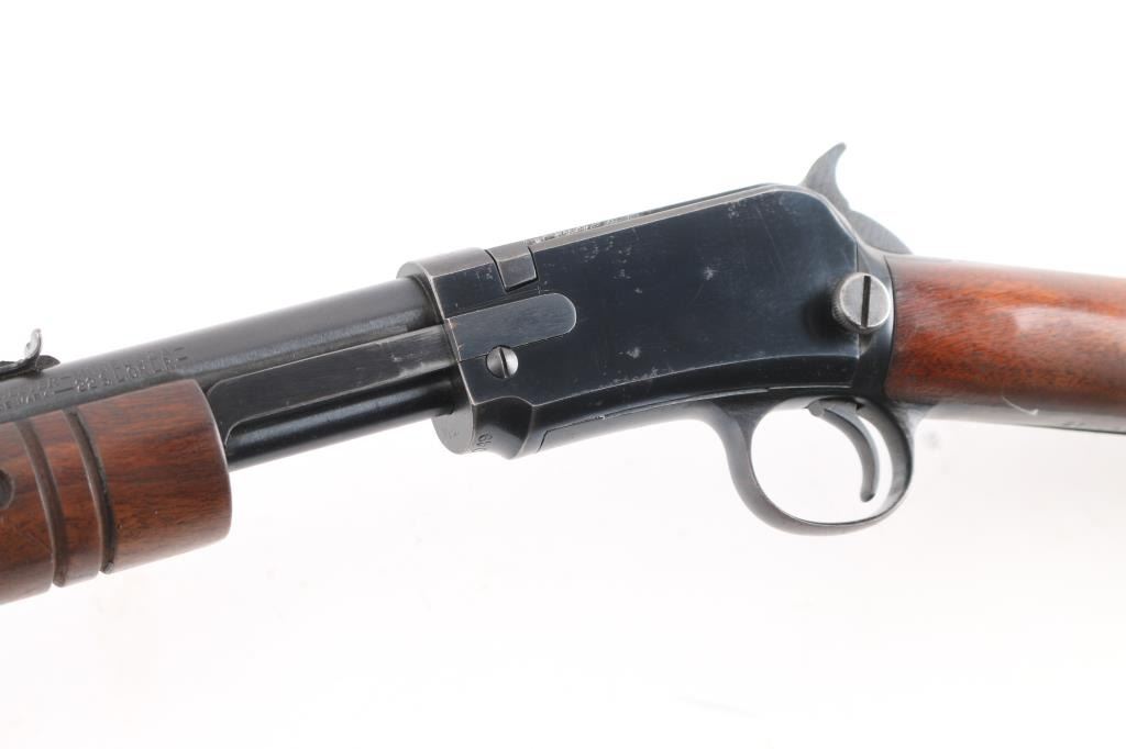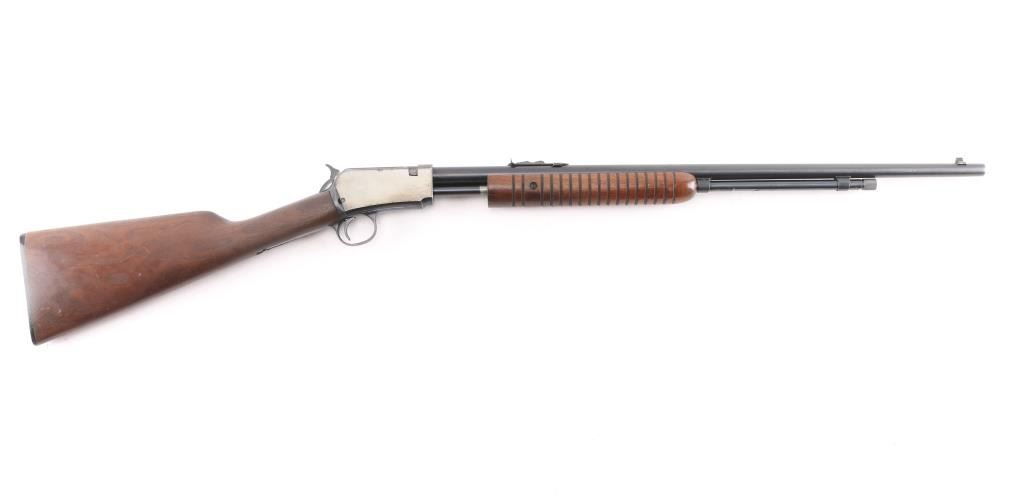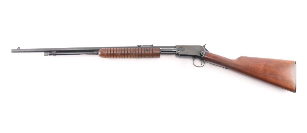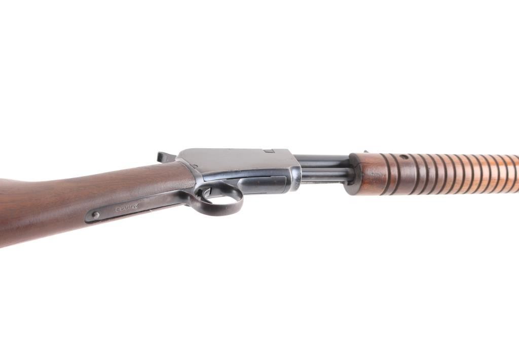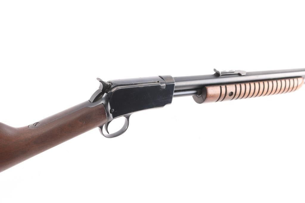 American made slide action, rimfire rifle chambered for .22 Short, Long and Long Rifle cartridges, circa 1947. It sports a 23" round barrel with 3/4 magazine tube, a blued finish, dovetailed blade/bead front sight, adjustable rear sporting sight, take-down receiver, serrated hammer spur, smooth trigger, grooved walnut slide handle and smooth straight grip shoulder stock with factory hard rubber buttplate. Bore is excellent/bright, blue finish is about 94% with some very minor scratches, and handling wear on the tangs/triggerguard, There is some very minor spots of pitting on the receiver, barely noticeable. wood is near excellent with some minor scratches/dings, action is crisp/smooth. Matching serial number on receiver, & lower tang.