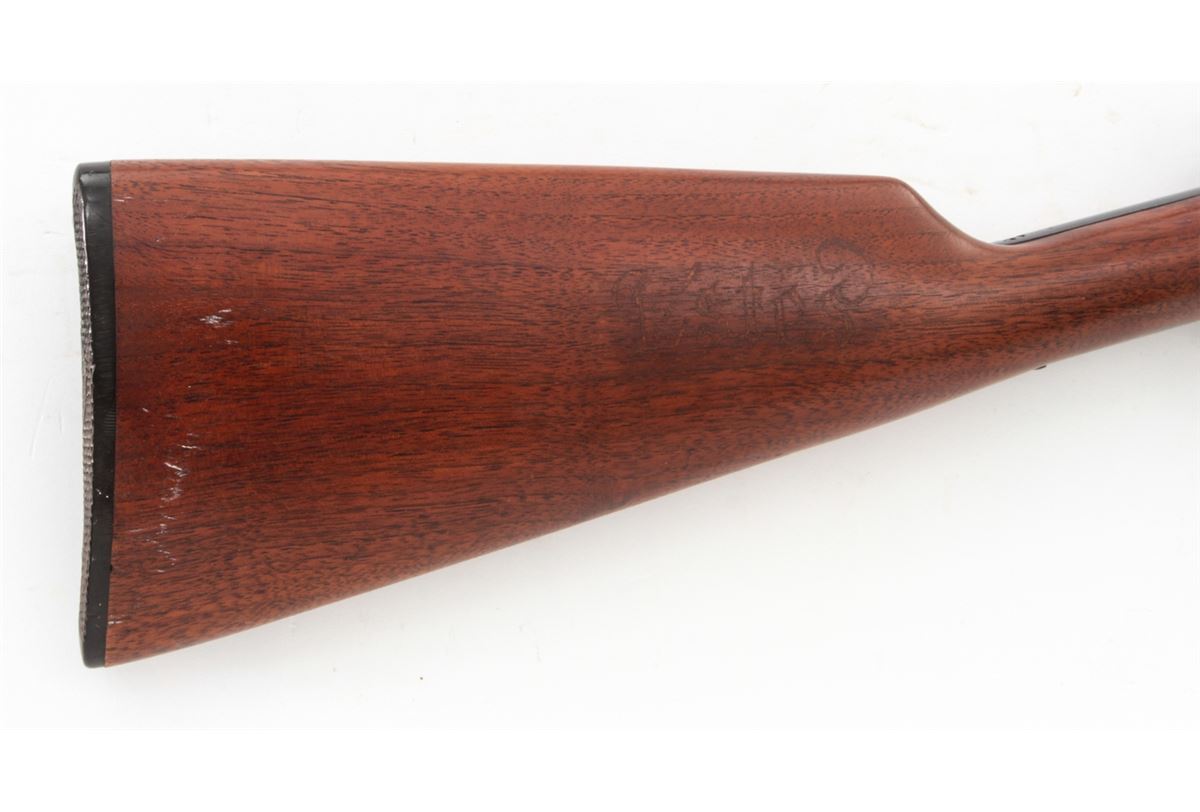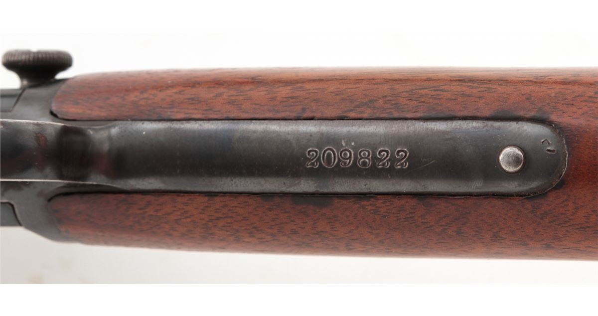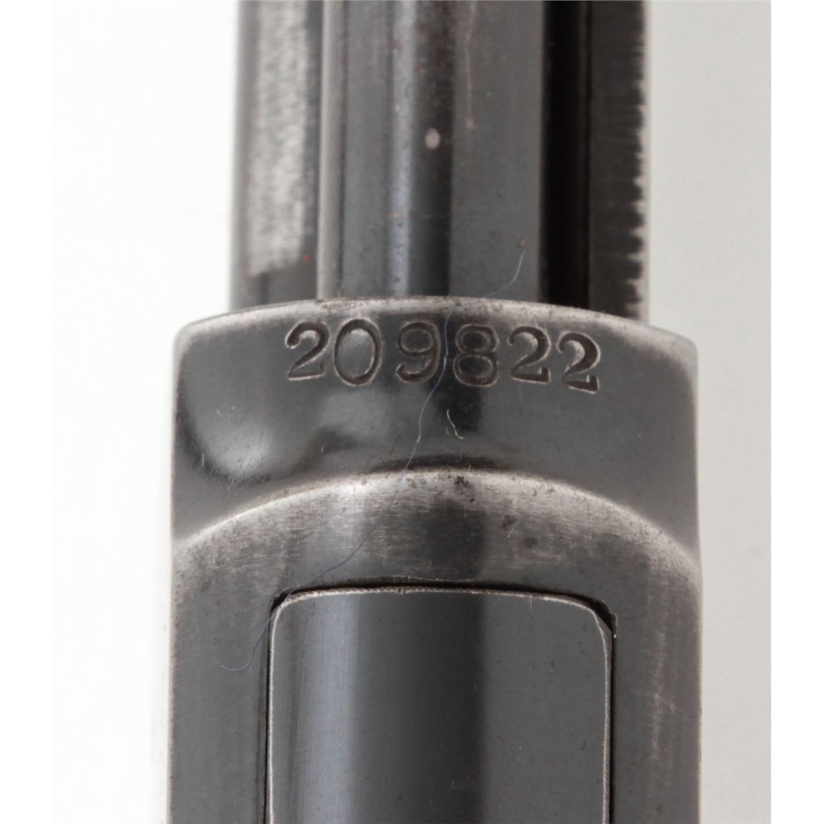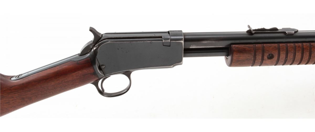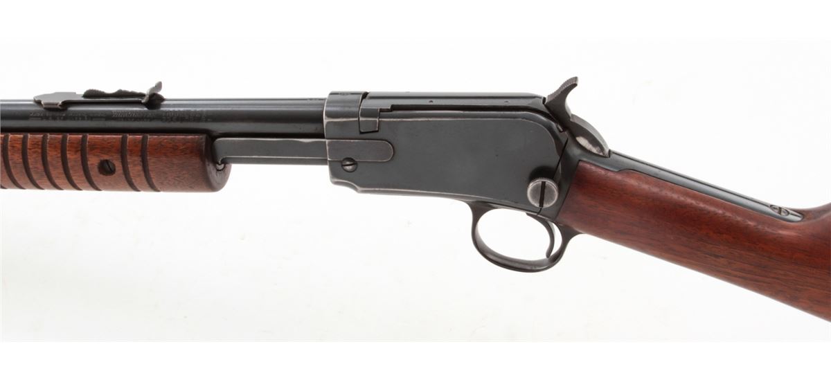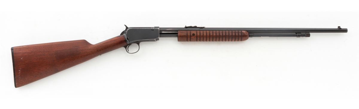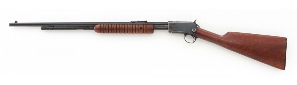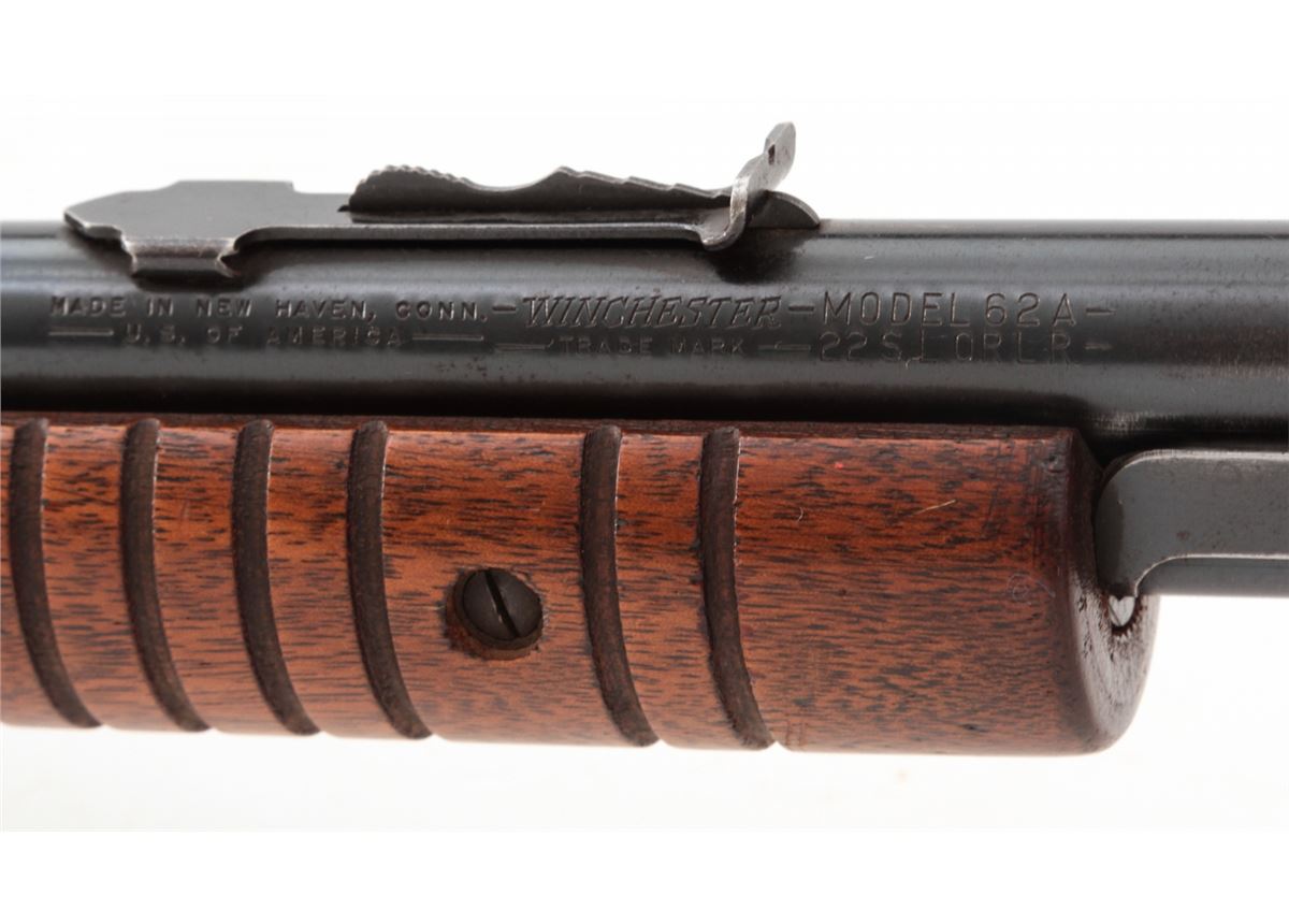 Winchester Model 62A Pump Action Rifle, #209822, .22 SL/LR cal., 23'' round barrel, blue finish, walnut stock, with 17-groove forend. Mfg'd 1947. Condition is near excellent retaining approx. 94% original factory blue. Walnut stock is excellent, however faintly inscribed in the right cheek area ''Estes'' in old English style script. Markings are shallow and can easily be removed. Action remains crisp, bore is bright. Est.: $600-$800. (C&R)