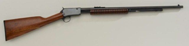 Winchester Model 62A pump action 22 short caliber gallery type rifle, like new in original box, serial #407808. The rifle shows 99% plus original blue with excellent wood, some minute handling, assembly andpossibly minimal firing only. The box contains its wax paper, original tag, instructions sheet and safety booklet. Box shows a correct numbered end label and is in very good condition with some minor wear andtears. A strong 9.9 on 1-10 scale. If it were a coin we’d grade it at MS64 plus. Est.;$2,500-$5,000.