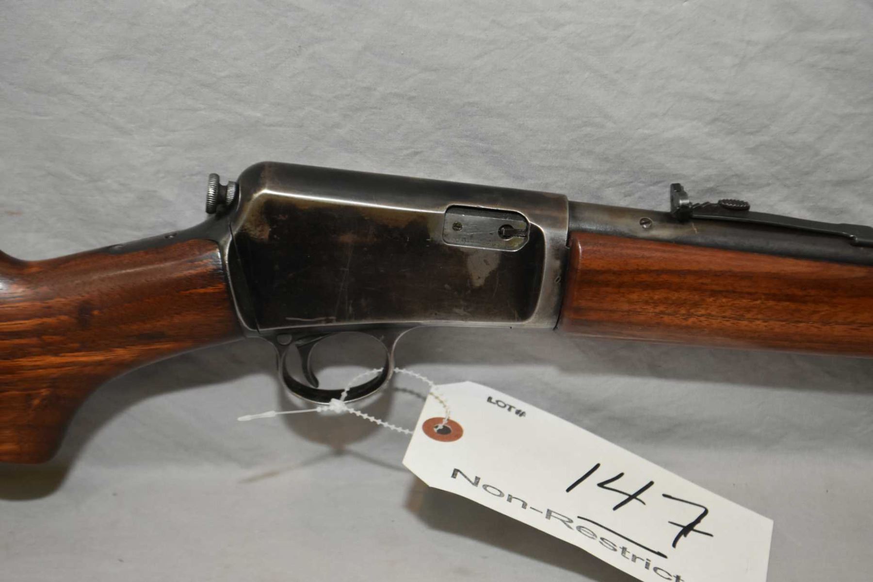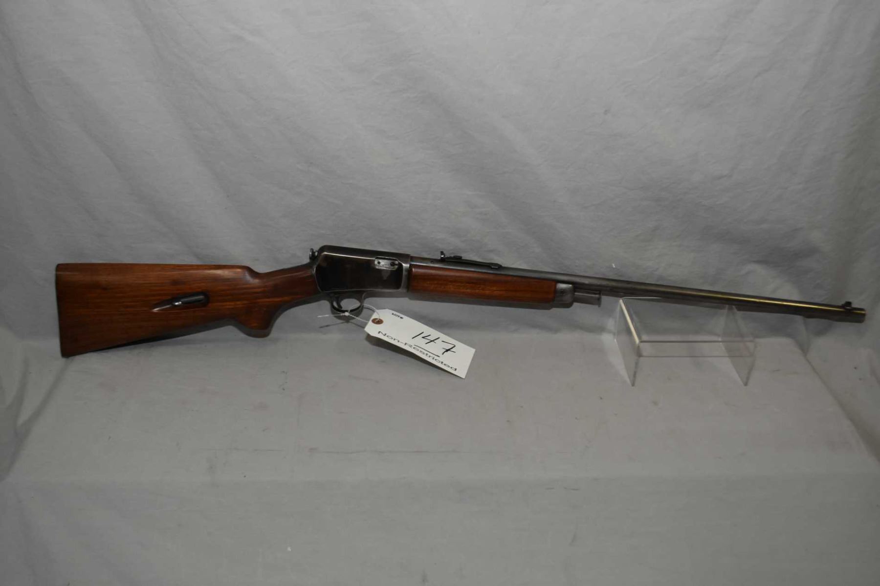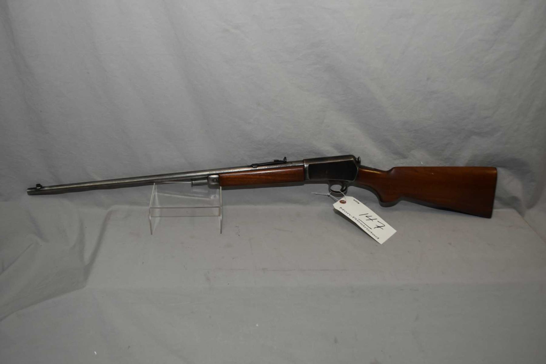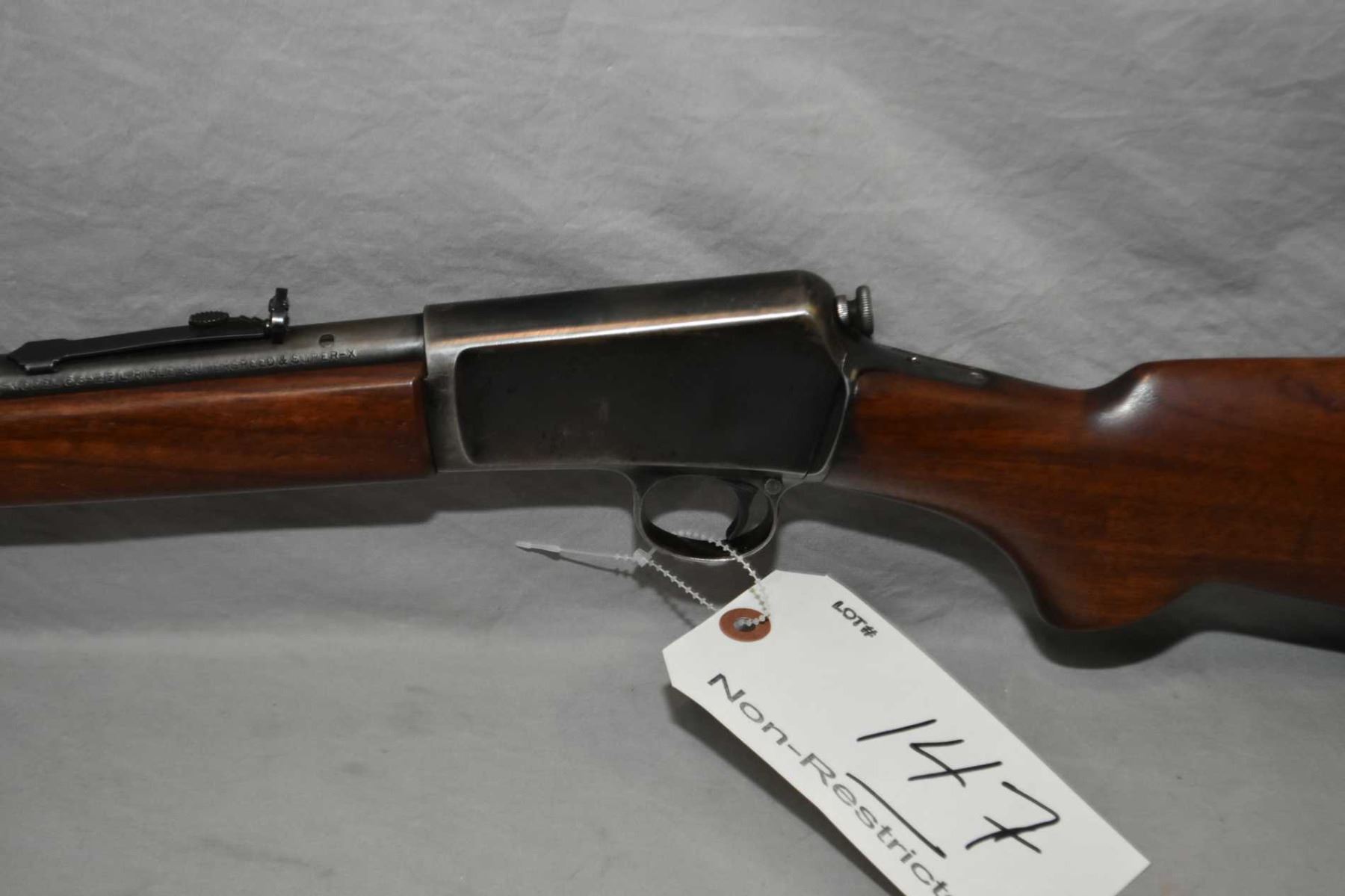 Winchester Model 63 22 LR Cal Tube Fed Semi Auto Rifle w/ 23" round barrel [ blued finish fading to grey in some areas, barrel sights, refinished wood with some age cracks behind receiver, upper tang, metal butt plate with mag tube, Circa 1942 ] Ser # 50230