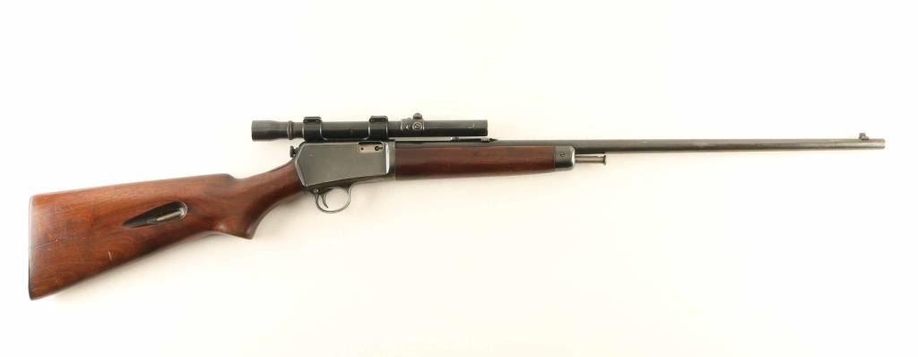 Rifle .Semi-Automatic. Manufactured 1948. Take-down. 23" round barrel, with Low notch rear, and front blade sights. Charge the chamber by pushing rod at the front forearm, and lock the bolt back by turning rod. Integral tube magazine in stock. Cross bolt safety behind trigger. Smooth walnut stock, and forearm are good with minor scratches/dings. There is a 4.5" crack, with a small chip on the left firearm. Blued metal finish is about 75%, with edge wear, scratches, and finish loss, mostly to the underside of the receiver. Bore appears very good/Bright. Action is crisp/tight. Mounted with a vintage Weaver J 2.5 Scope, clear optics. NRA Condition-Very Good. C&R Firearm.