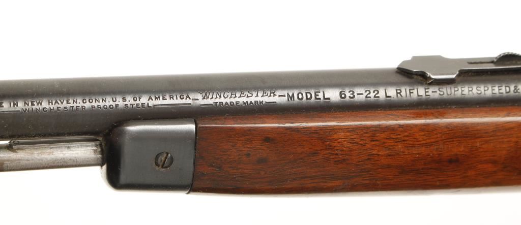Semi-auto takedown re-conditioned rimfire (Super speed & Super X) rifle. Blued 22-1/2" unmarred barrel. Bore is un-pitted but dark and rifling looks worn. Non-checkered plain pistol grip stock and fore grip showing heavy with deep scratches on left of the stock. Receiver and action appear to be in good working order Stock-fed tubular 10 rd. magazine. Charging rod looks to be in original condition. Overall condition is Good. Modern Firearm